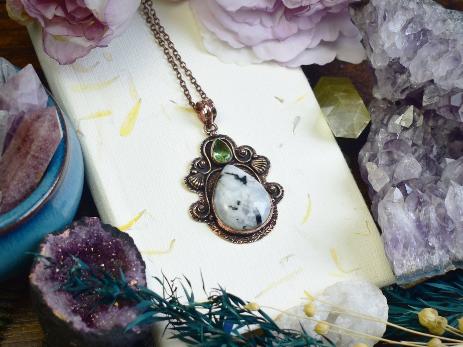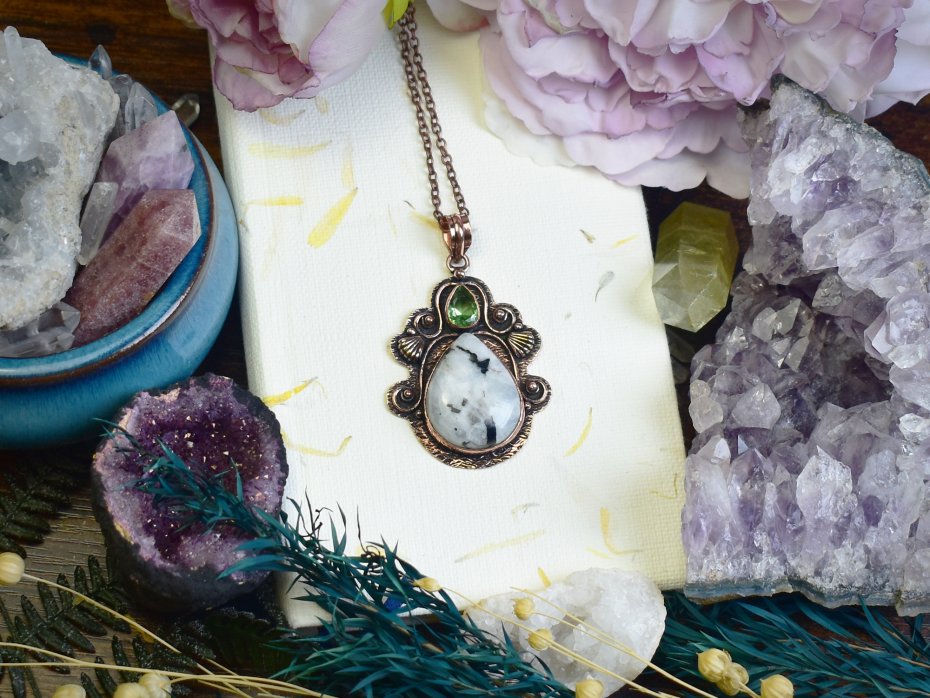 Poza tym zajmuję się oprawą kamieni. Używam kamieni naturalnych, kocham labradoryty, ametysty i kwarce. Do oprawy używam miedzi i cyny w technice tiffany oraz miedzi do elektroformowania. Inspiruję się naturą chcąc stworzyć wisiorki i amulety wyglądające jak z gier fantasy :)