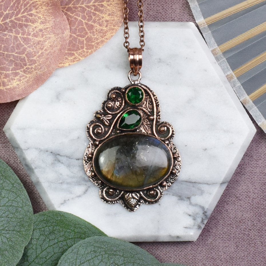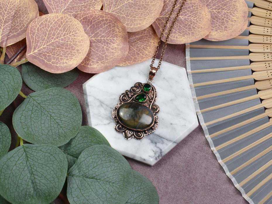 Piękny wisiorek z miedzi ozdobiony labradorytem i zielonym kwarcem to wyjątkowy dodatek do Twojej kolekcji biżuterii. Labradoryt, znany ze swoich tajemniczych refleksów, dodaje wisiorkowi subtelnego blasku, podkreślając elegancję designu. Dodatkowo, zielony kwarc wprowadza do Twojego życia energię harmonii i równowagi, co sprawia, że ten wisiorek nie tylko pięknie wygląda, ale również przynosi pozytywne wibracje.