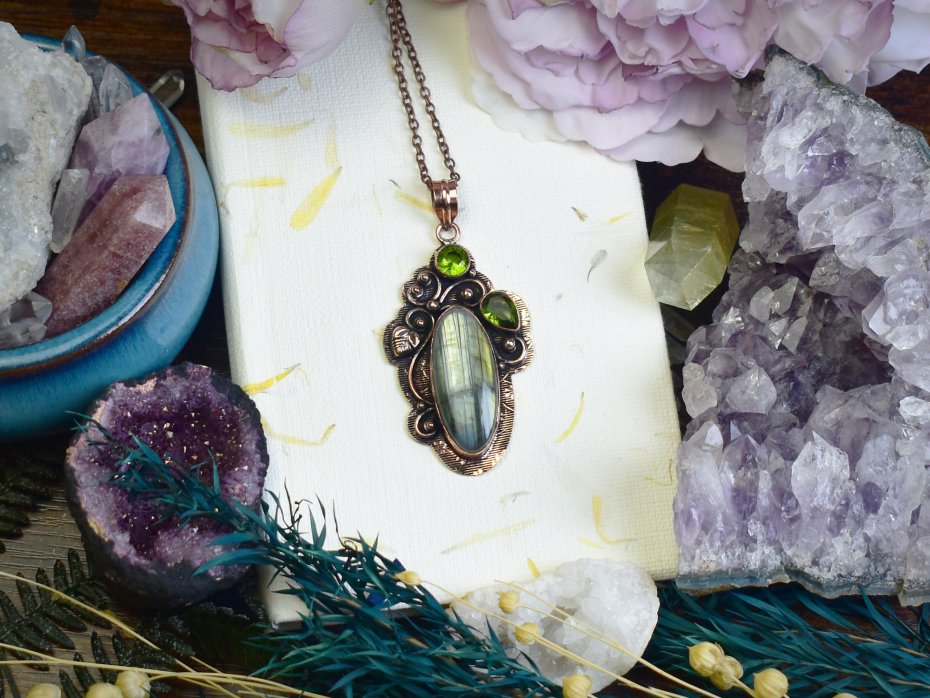 Poza tym zajmuję się oprawą kamieni. Używam kamieni naturalnych, kocham labradoryty, ametysty i kwarce. Do oprawy używam miedzi i cyny w technice tiffany oraz miedzi do elektroformowania. Inspiruję się naturą chcąc stworzyć wisiorki i amulety wyglądające jak z gier fantasy :)