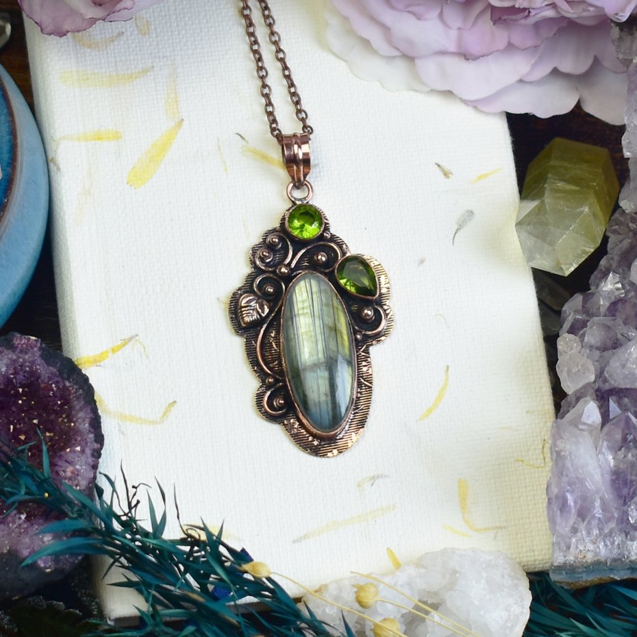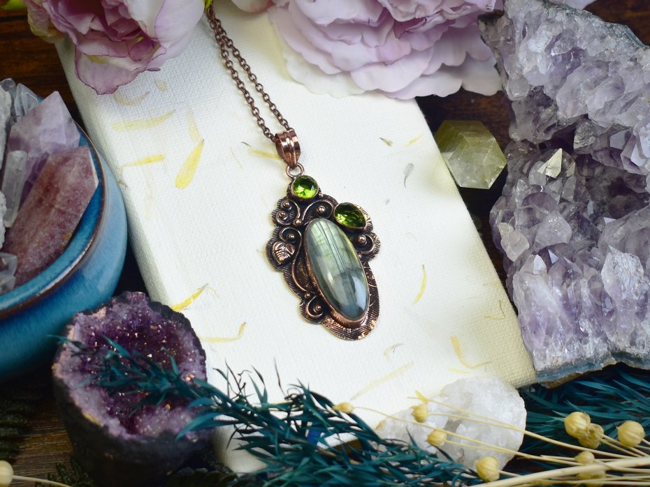 Wisiorek z miedzi ozdobiony labradorytem i zielonym kwarcem, stworzony przy użyciu tradycyjnych technik jubilerskich. Labradoryt, z charakterystycznym efektem tęczowego połysku, symbolizuje intuicję i ochronę, podczas gdy zielony kwarc wprowadza harmonię i spokój. Całość łączy naturalne piękno kamieni z rzemieślniczą precyzją, tworząc unikalną biżuterię, która przyciąga wzrok i nadaje każdej stylizacji wyjątkowego charakteru.