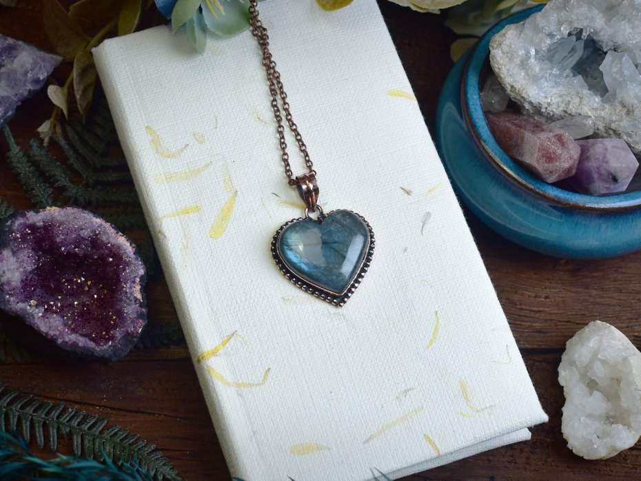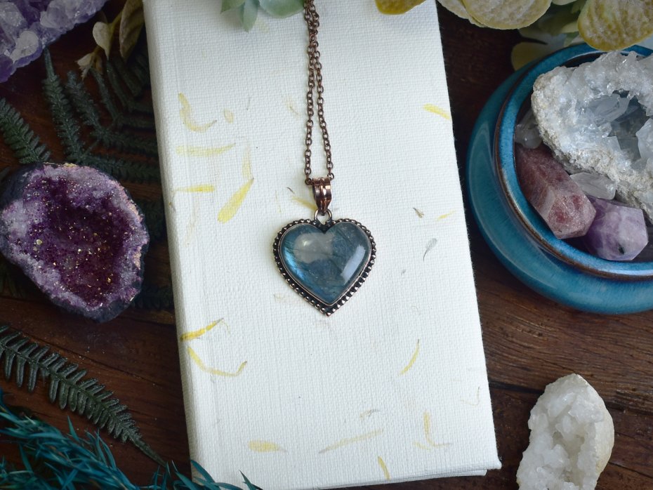 Miedziany wisiorek w kształcie serca z labradorytem, wykonany tradycyjnymi technikami jubilerskimi. Labradoryt, kamień o wyjątkowej grze barw, symbolizuje intuicję i ochronę. Jego charakterystyczne refleksy świetlne nadają biżuterii niepowtarzalny, mistyczny wygląd. Wisiorek stanowi doskonałe połączenie subtelnego designu i siły kamienia, który wspomaga rozwój duchowy i dodaje odwagi. Doskonały wybór dla osób szukających elegancji połączonej z energią natury.