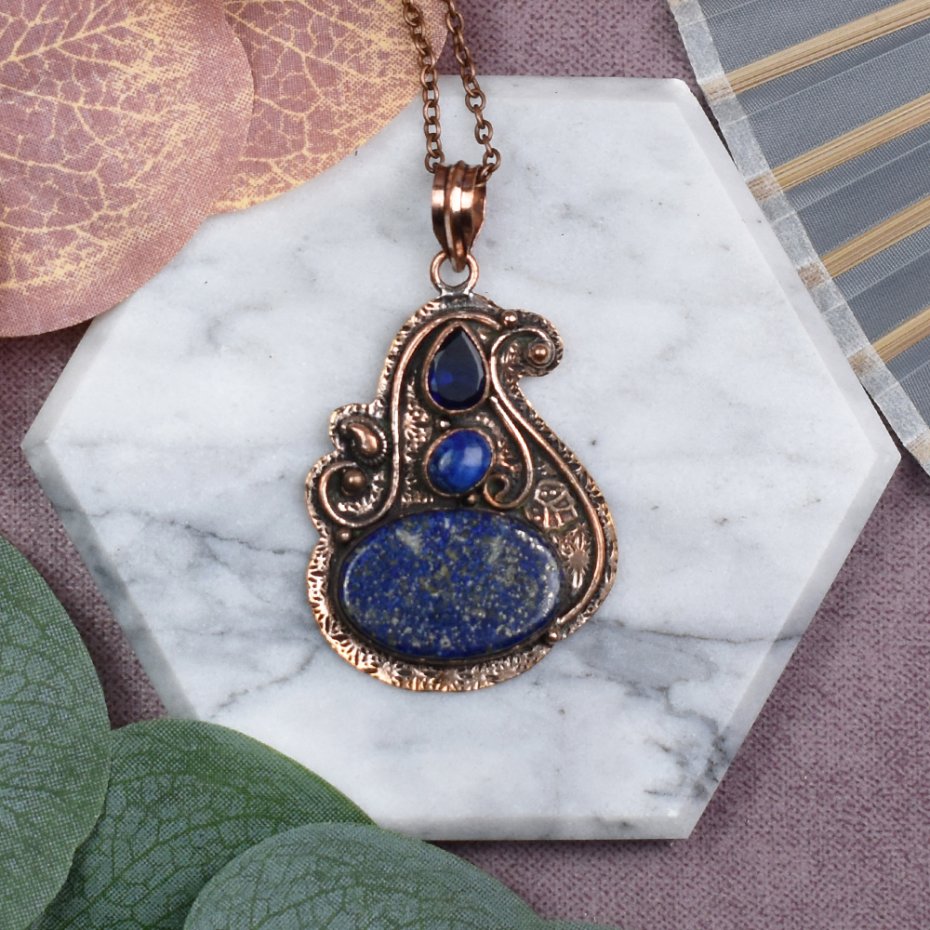 Piękny wisiorek z miedzi ozdobiony lapis lazuli i sztucznym tanzanitem, stworzonym w laboratorium, to elegancki dodatek do każdej stylizacji. Lapis lazuli to kamień mądrości i wewnętrznego spokoju, który pobudza intuicję i wspiera komunikację. Sztuczny tanzanit dodaje mu subtelnego blasku, symbolizując duchową odnowę i klarowność myśli. Idealny wybór dla tych, którzy cenią nie tylko piękno, ale także znaczenie i energię kamieni naturalnych.