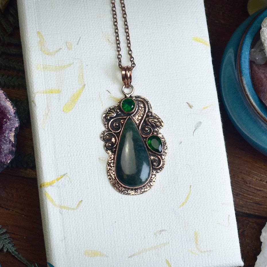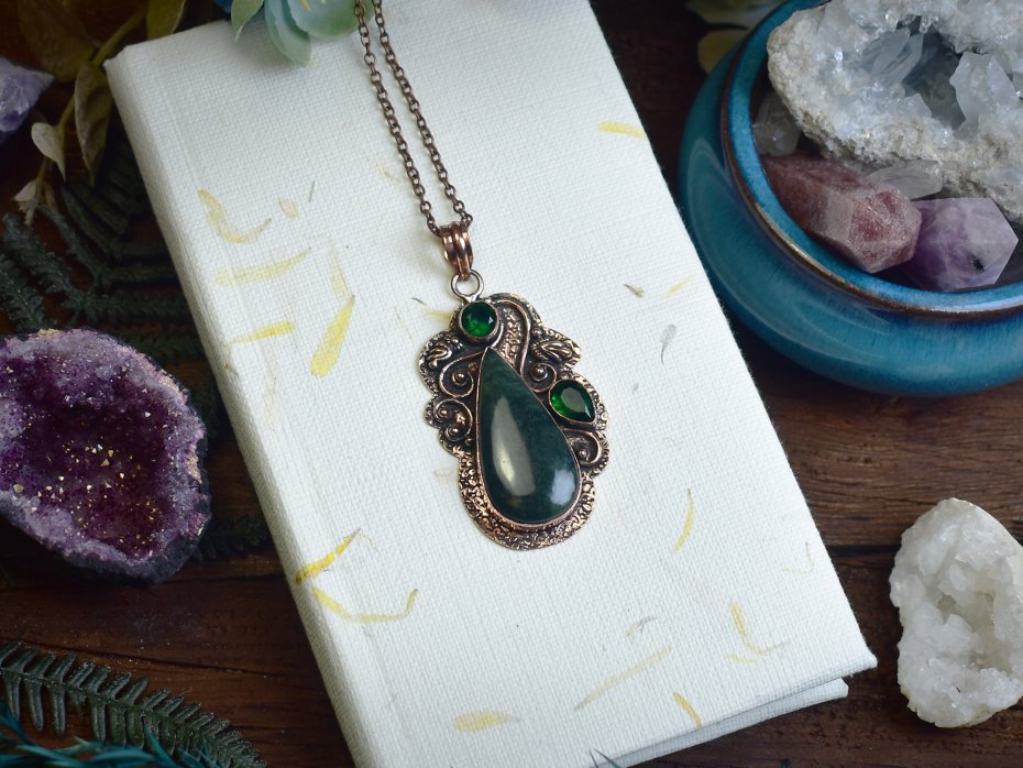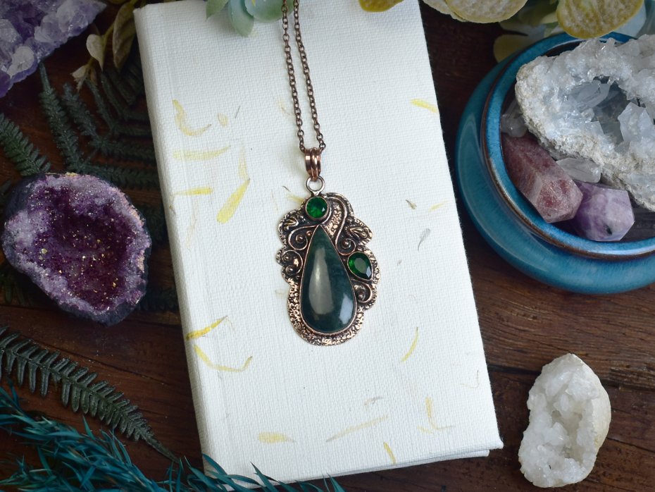 Miedziany wisiorek ozdobiony nefrytem i zielonym kwarcem, wykonany tradycyjną metodą obróbki miedzi. Kamienie te od wieków uznawane są za symbole harmonii, zdrowia i ochrony. Nefryt, z jego uspokajającą zieloną barwą, oraz zielony kwarc, kojarzący się z równowagą i odnową, w połączeniu z miedzią tworzą niepowtarzalny talizman. Wisiorek jest subtelną ozdobą, która wzmacnia pozytywną energię, przyciągając spokój i witalność.