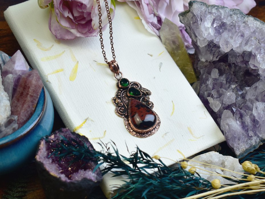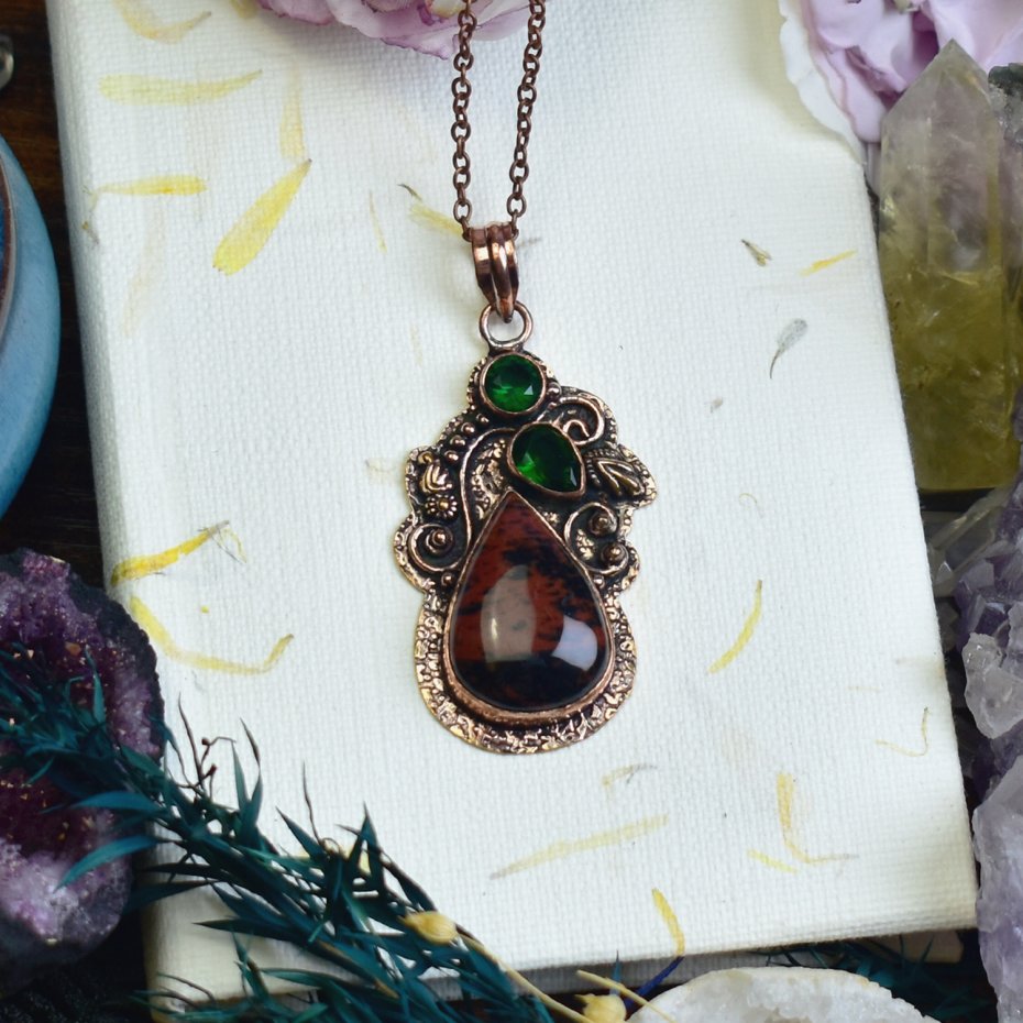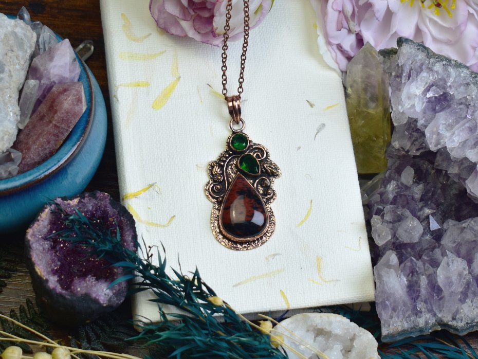 Ręcznie wykonany wisiorek z mahoniowym obsydianem i niewielkim zielonym kwarcem. Naturalne kamienie symbolizują siłę, ochronę i wewnętrzną harmonię. Obsydian dodaje pewności siebie i chroni przed negatywną energią, a kwarc sprzyja równowadze. Klasyczna forma i tradycyjne rzemiosło nadają mu ponadczasowy charakter.