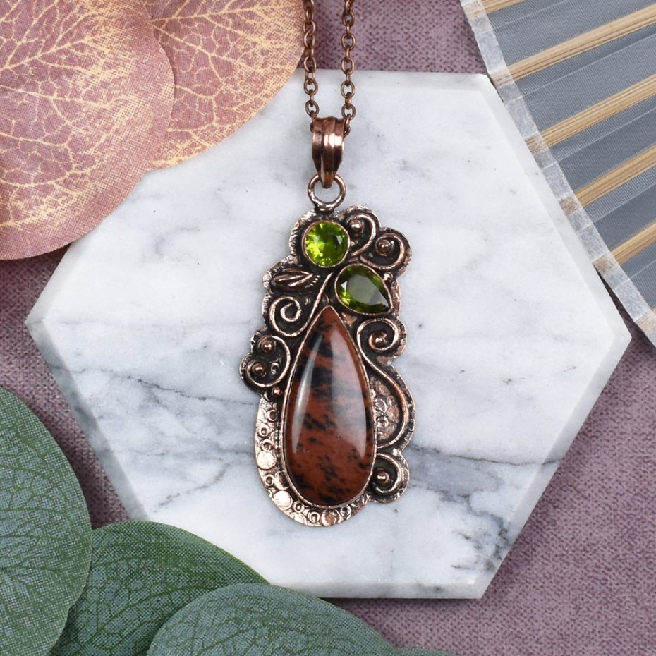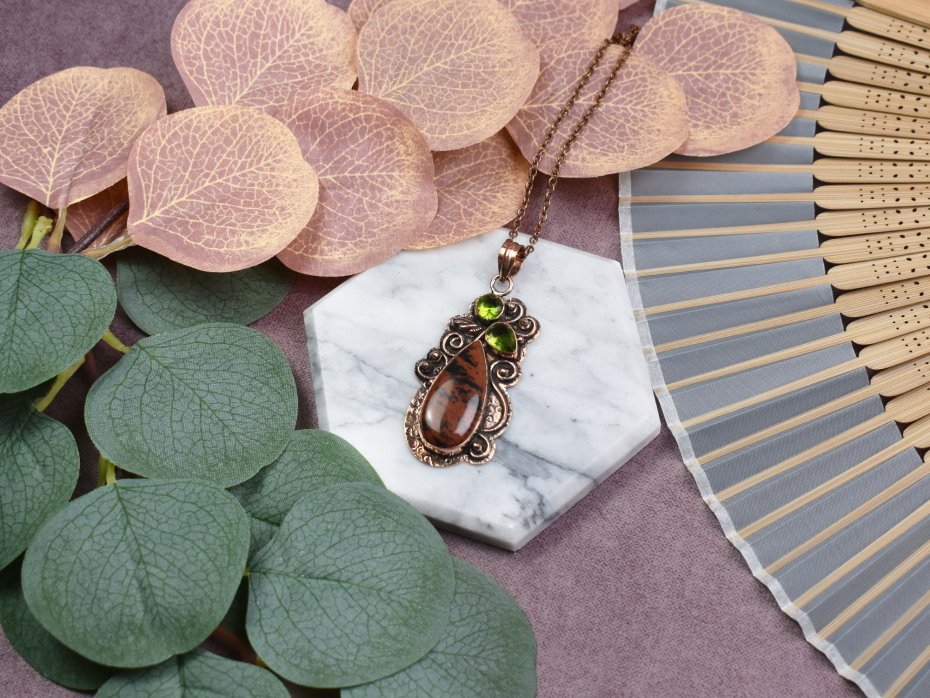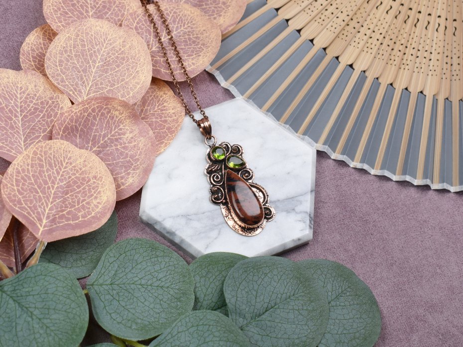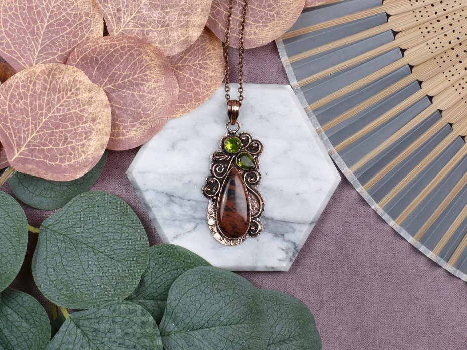 Elegancki wisiorek z miedzią, obsydianem mahoniowym i peridotem to nie tylko ozdoba, ale także talizman pełen symboliki. Obsydian mahoniowy znany jest ze swoich właściwości ochronnych, pomagając oczyszczać negatywne energie. Peridot natomiast jest kamieniem szczęścia, przyciągającym dobrobyt i pozytywną energię. Ten wyjątkowy wisiorek łączy w sobie piękno ręcznie wykonanej biżuterii z pozytywnym wpływem kamieni na nasze samopoczucie.