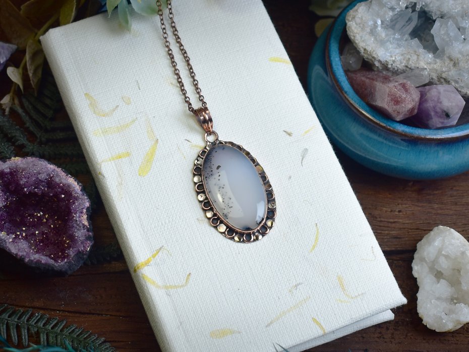 Ręcznie wykonany wisiorek z opalem dendrytowym, osadzonym w posrebrzanej miedzianej oprawie. Wykonany tradycyjnymi technikami, łączy naturalne piękno kamienia z rzemieślniczym kunsztem. Opal dendrytowy, znany jako kamień równowagi i duchowej harmonii, inspiruje do wewnętrznego spokoju i refleksji. Unikalny dodatek o subtelnym, mistycznym charakterze.