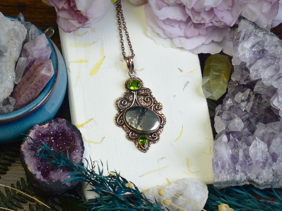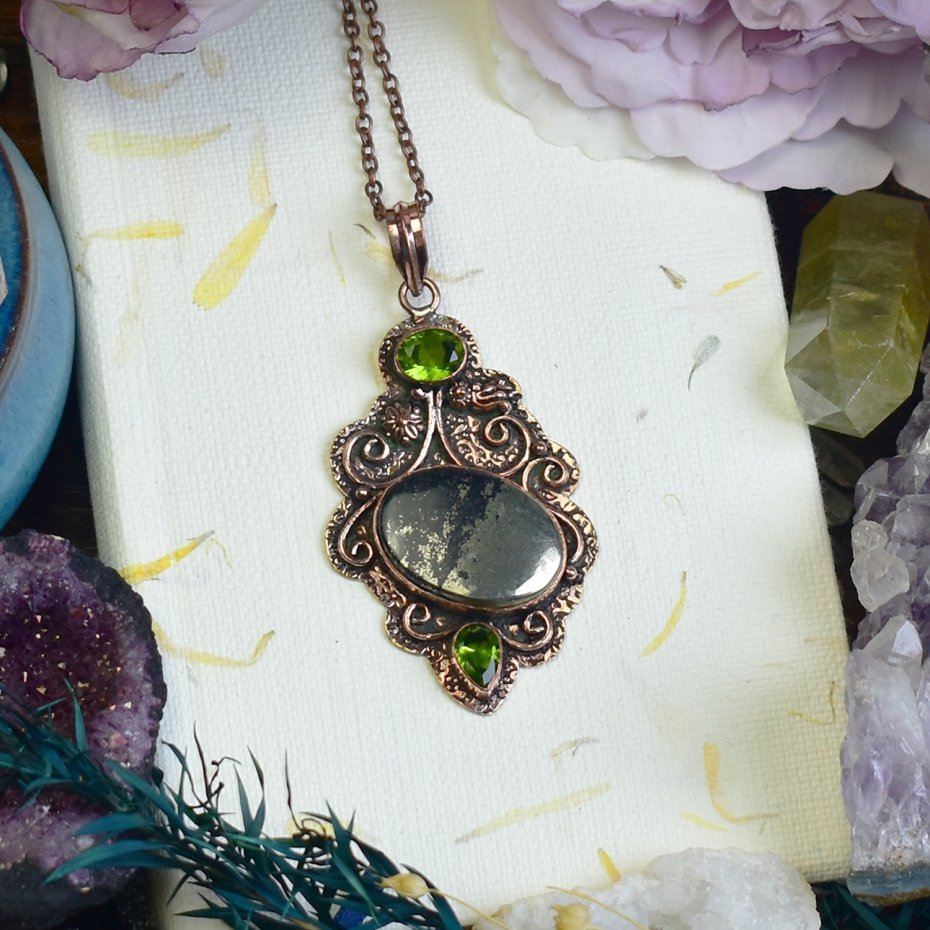 Unikatowy miedziany wisiorek z apache pirytem i peridotem, wykonany tradycyjnymi metodami. Apache piryt, znany ze swojego metalicznego połysku i surowego charakteru, symbolizuje siłę oraz ochronę. Peridot, kamień o świeżym zielonym odcieniu, wspiera wewnętrzną harmonię i pozytywną energię. Połączenie tych minerałów nadaje wisiorkowi niepowtarzalny wygląd i mistyczny charakter. Idealny dla osób ceniących biżuterię inspirowaną naturą i duchowością.