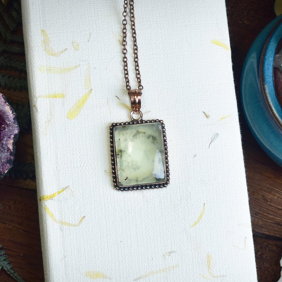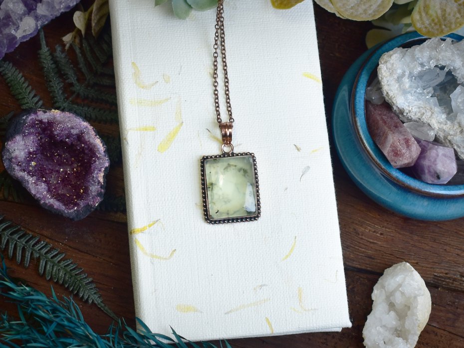 Miedziany wisiorek z prehnitem wykonany tradycyjnymi technikami to subtelna biżuteria, która łączy naturalne piękno kamienia z kunsztem rzemieślniczym. Prehnit, o delikatnej zielonej barwie, od wieków uważany jest za kamień sprzyjający harmonii i ochronie. Wisiorek stanowi wyjątkowy dodatek, który nie tylko zdobi, ale także działa jak talizman, wspierający spokój oraz wewnętrzną równowagę. Jego minimalistyczny design sprawia, że jest idealnym wyborem dla osób ceniących subtelną elegancję.