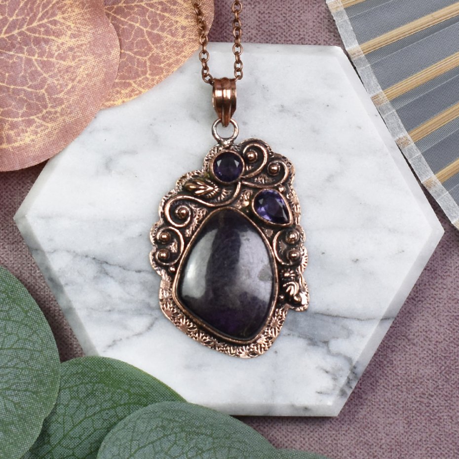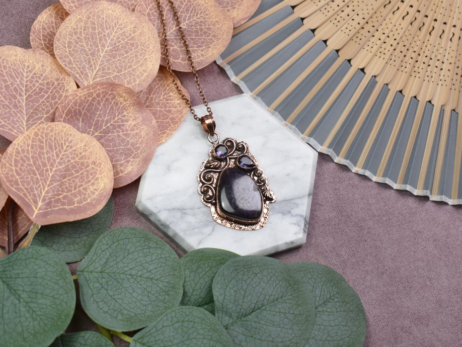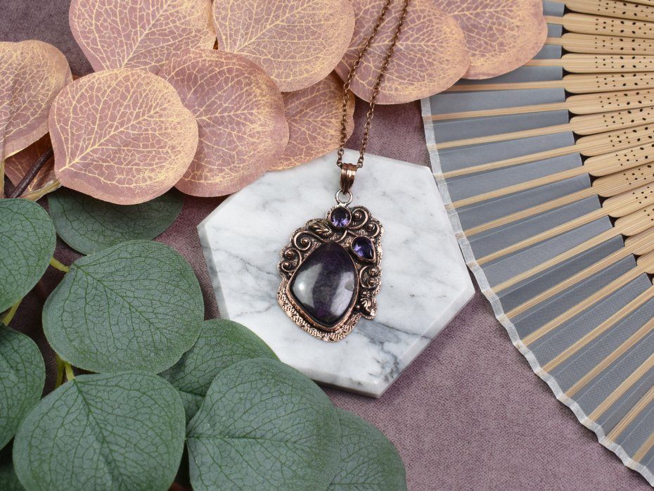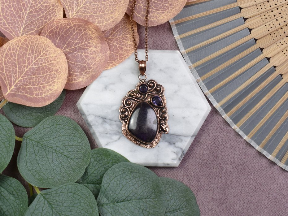 Elegancki wisiorek z miedzi ozdobiony purpurytem i ametystem to subtelna ozdoba, która dodaje blasku i uroku każdej stylizacji. Purpuryt, znany jako kamień rozwoju duchowego, dodaje głębi i tajemniczości, podczas gdy ametyst, kamień harmonii, przynosi spokój i równowagę. To nie tylko biżuteria, ale również talizman pełen pozytywnej energii i estetycznego wdzięku.
