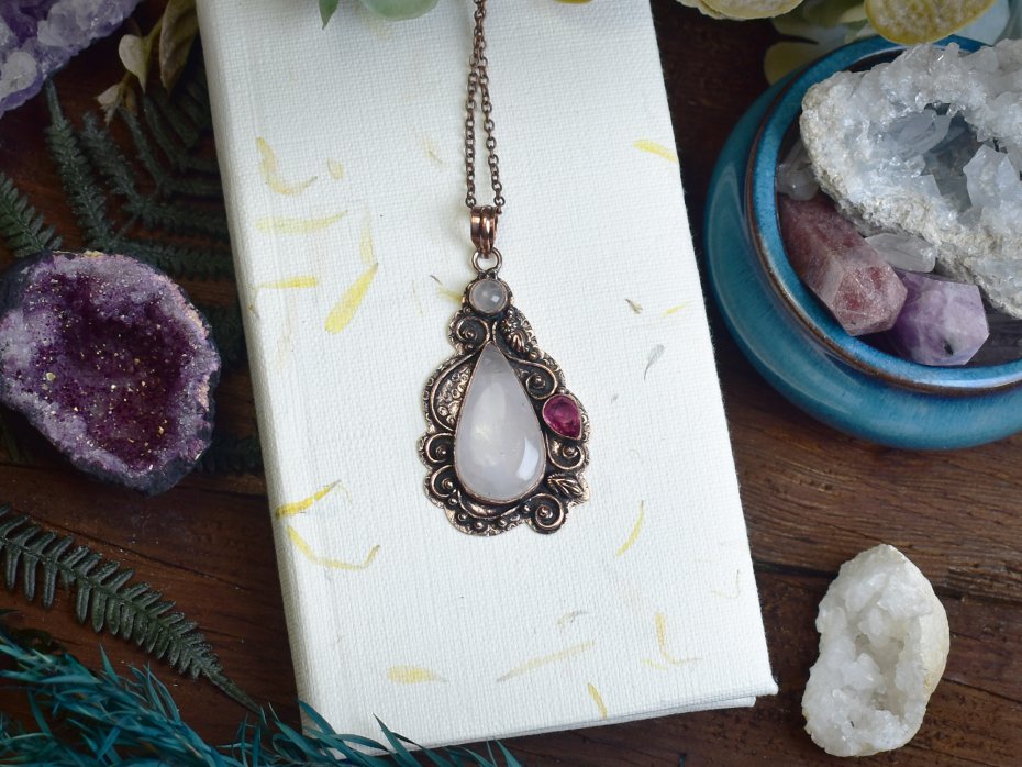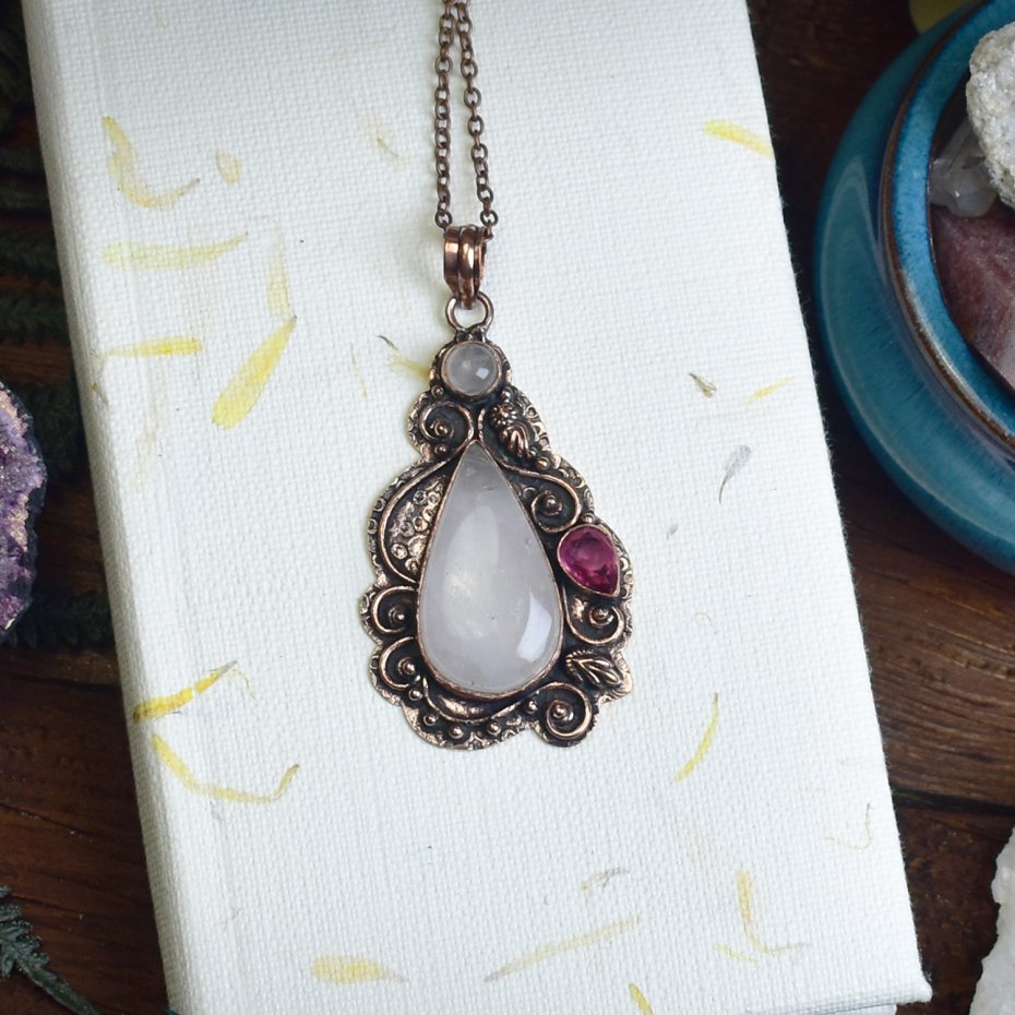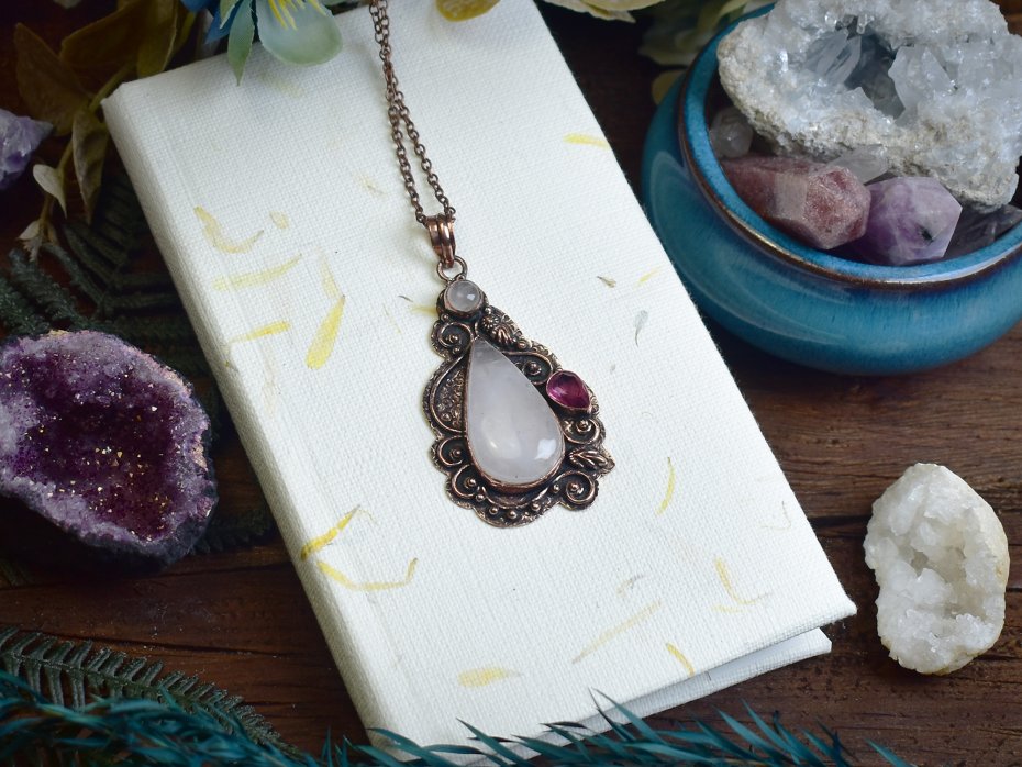 Ręcznie wykonany miedziany wisiorek z różowym kwarcem i syntetycznym różowym topazem, stworzony przy użyciu tradycyjnych technik jubilerskich. Delikatne odcienie kamieni podkreślają unikalny charakter biżuterii, a motyw harmonii i spokoju sprawia, że wisiorek jest nie tylko ozdobą, ale także talizmanem wspierającym równowagę emocjonalną i pozytywną energię. Naturalne piękno minerałów połączone z rzemieślniczą precyzją tworzy ponadczasowy dodatek, który doskonale pasuje do różnych stylizacji.