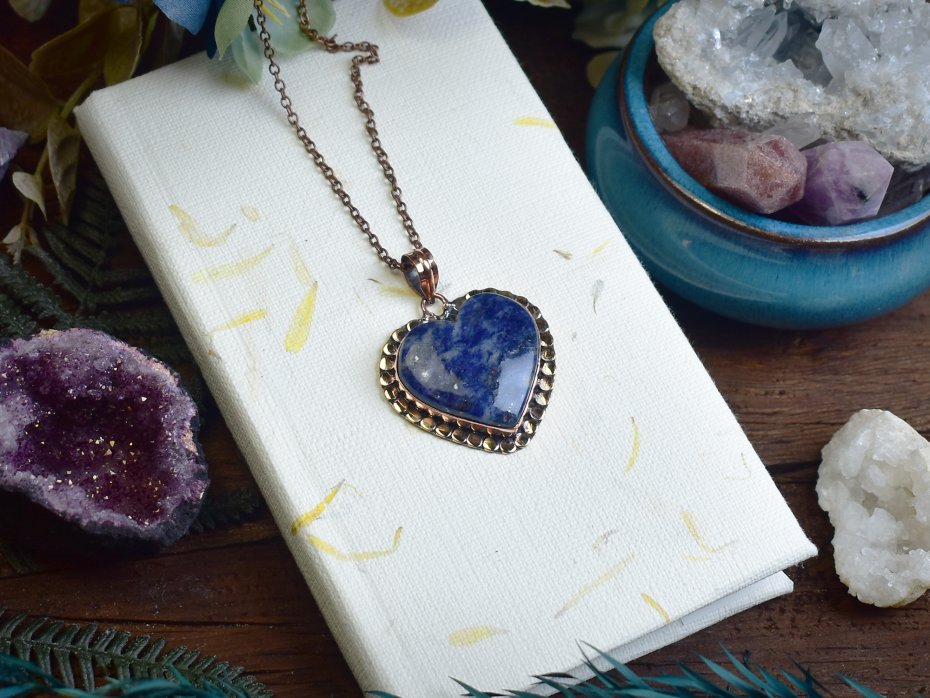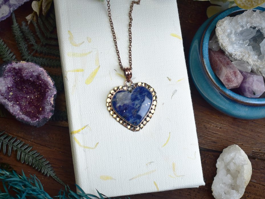 Ręcznie wykonany miedziany wisiorek z sodalitem w kształcie serca. Kamień o głębokim, niebieskim odcieniu od wieków symbolizuje mądrość, intuicję i wewnętrzny spokój. Sodalit pomaga w koncentracji, wzmacnia pewność siebie i sprzyja harmonii myśli. Oryginalna oprawa, wykonana tradycyjnymi technikami, podkreśla surowy charakter miedzi. Biżuteria łączy naturalne piękno minerału z rzemieślniczym kunsztem, tworząc wyjątkowy amulet niosący równowagę i pozytywną energię.