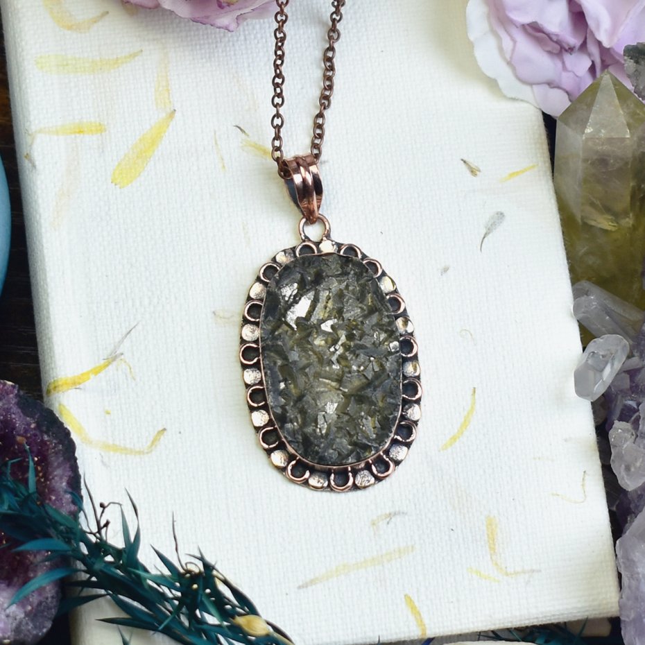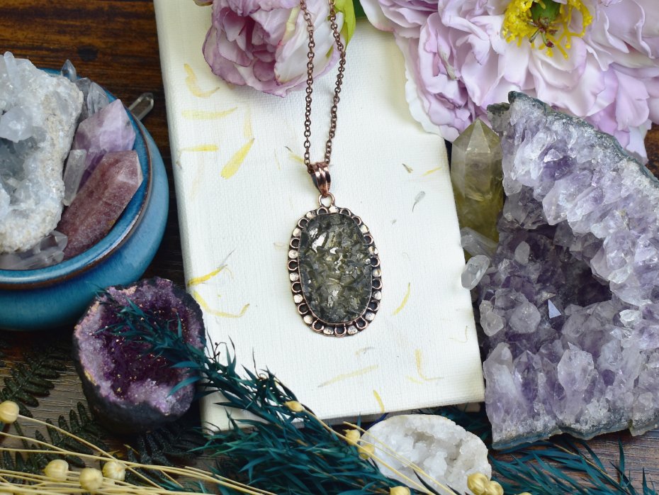 Miedziany wisiorek zdobiony surowym pirytem, wykonany tradycyjnymi technikami jubilerskimi. Piryt, nazywany "kamieniem słońca", symbolizuje siłę, witalność i dobrobyt. Jego złocisty blask przyciąga pozytywną energię i dodaje pewności siebie. Wisiorek łączy naturalny urok minerału z rzemieślniczym kunsztem, tworząc unikalną ozdobę i osobisty amulet.