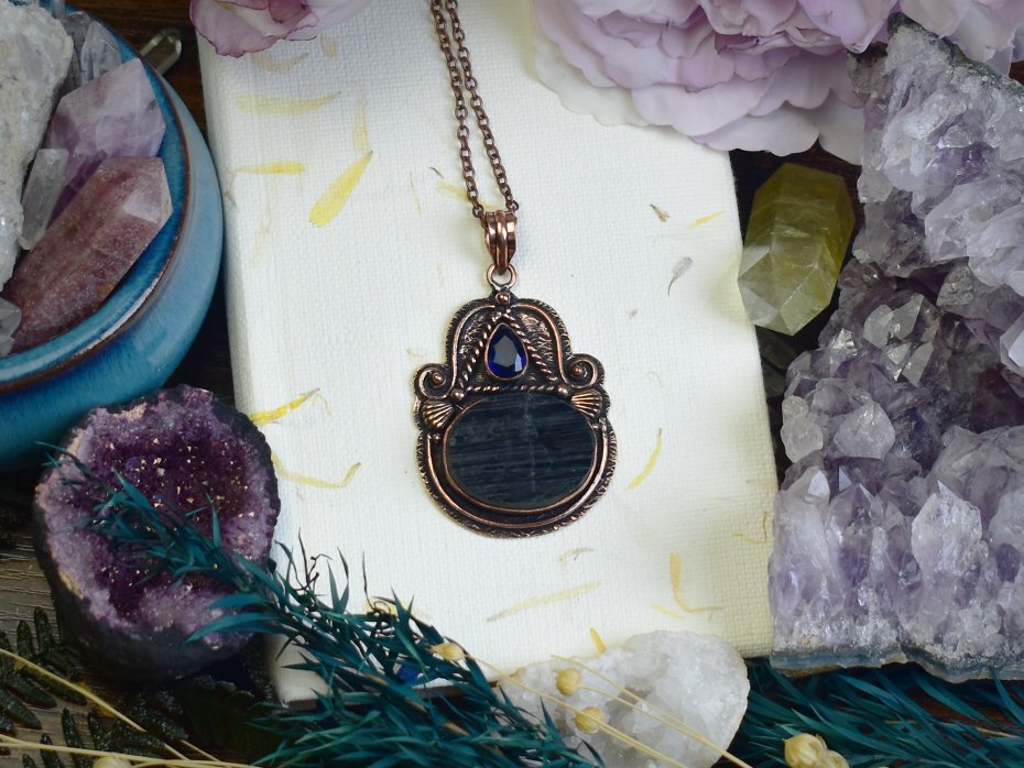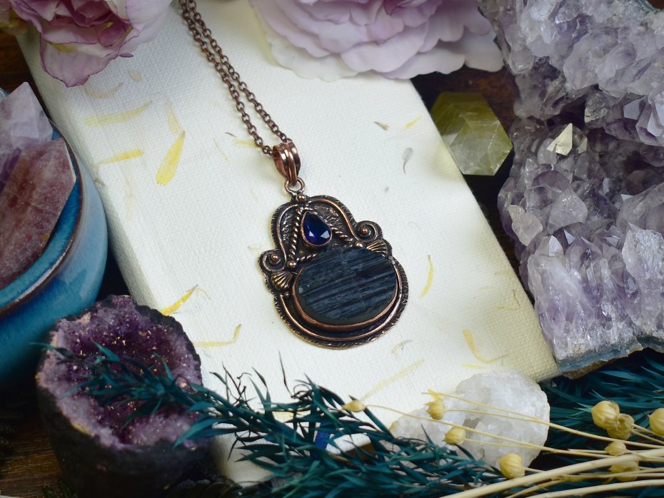 Ręcznie wykonany miedziany wisiorek z surowym czarnym turmalinem i syntetycznym tanzanitem, stworzony tradycyjnymi metodami jubilerskimi. Czarny turmalin od wieków uważany jest za kamień ochronny, pomagający odpierać negatywną energię. Syntetyczny tanzanit dodaje mu kontrastu i głębi, symbolizując duchowy rozwój. Połączenie tych minerałów z miedzią tworzy unikalny amulet, który łączy surową naturę kamieni z rzemieślniczym kunsztem.