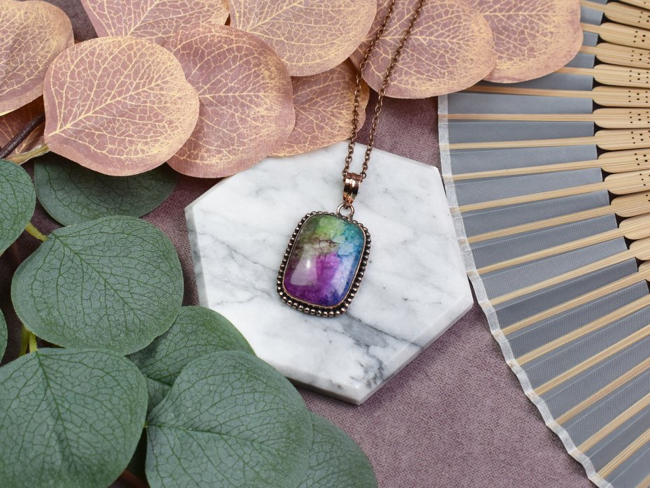 Ten elegancki wisiorek z miedzią zachwyca swoim prostym, lecz wyjątkowym designem, a jego centralnym elementem jest tęczowy agat słoneczny. Kamień ten nie tylko przyciąga wzrok swoimi subtelnymi odcieniami, ale również posiada unikalne właściwości. Agat słoneczny jest znany z tego, że pomaga w budowaniu wewnętrznej siły, równowagi i spokoju. Nosząc ten wisiorek, możesz cieszyć się nie tylko jego estetyką, ale także korzystać z pozytywnego wpływu kamienia na Twoje samopoczucie i harmonię życiową.