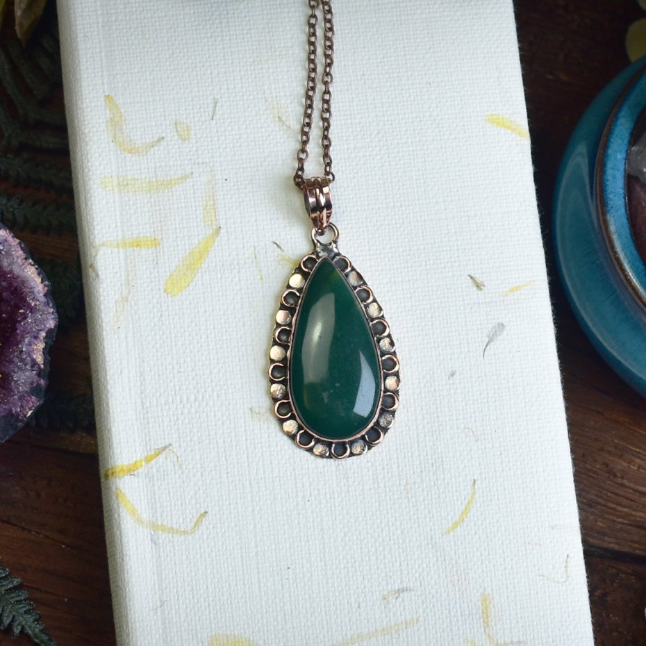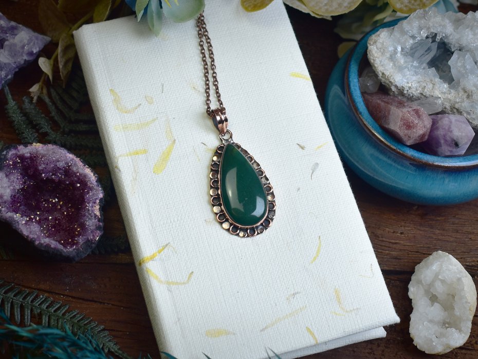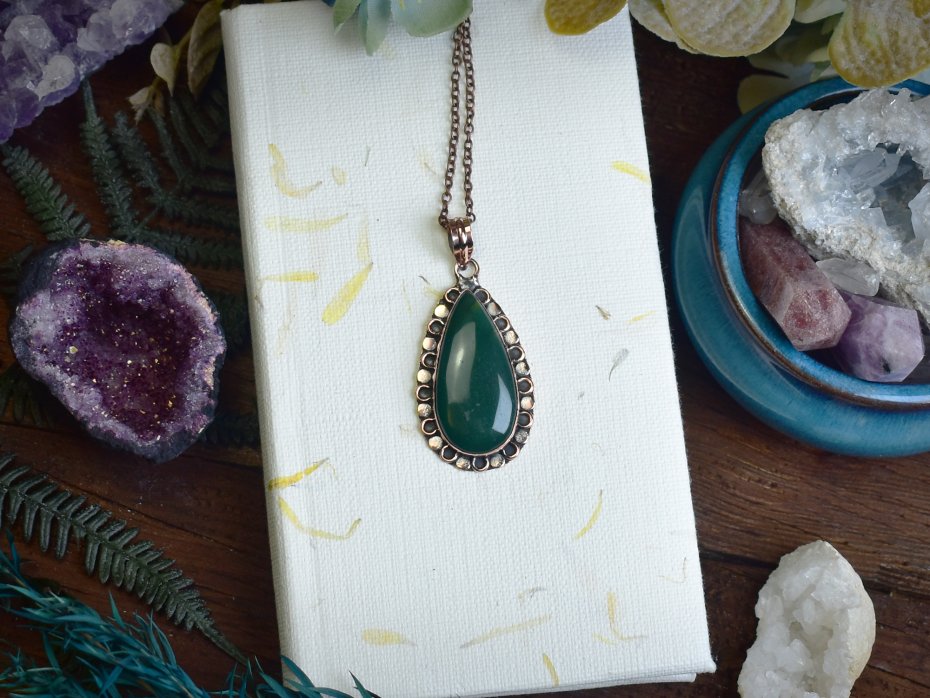 Miedziany wisiorek z zielonym onyksem, wykonany tradycyjnymi metodami jubilerskimi. Kamień o głębokiej, butelkowej zieleni symbolizuje stabilność, równowagę i ochronę. Onyx jest uznawany za kamień, który pomaga w utrzymaniu wewnętrznej harmonii, a także wspomaga koncentrację i siłę w trudnych chwilach. Wisiorek, łącząc naturalne piękno onyksem z precyzyjnie wykonaną miedzianą oprawą, staje się zarówno elegancką ozdobą, jak i talizmanem. Doskonały wybór dla osób poszukujących spokoju i pozytywnej energii.