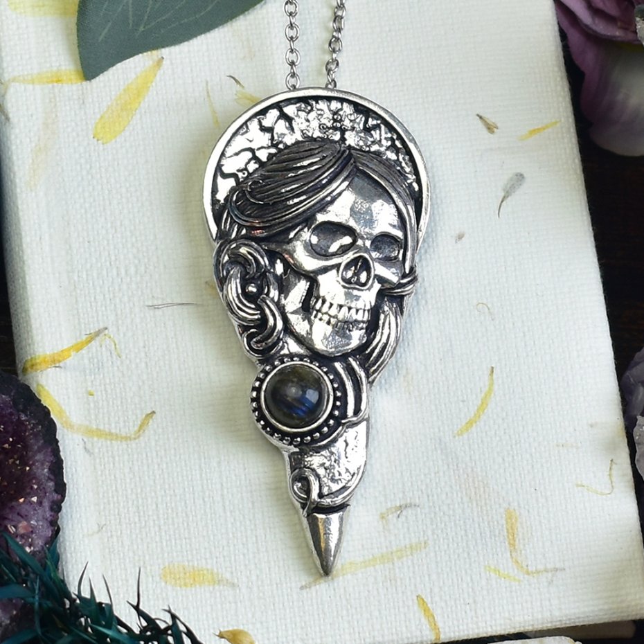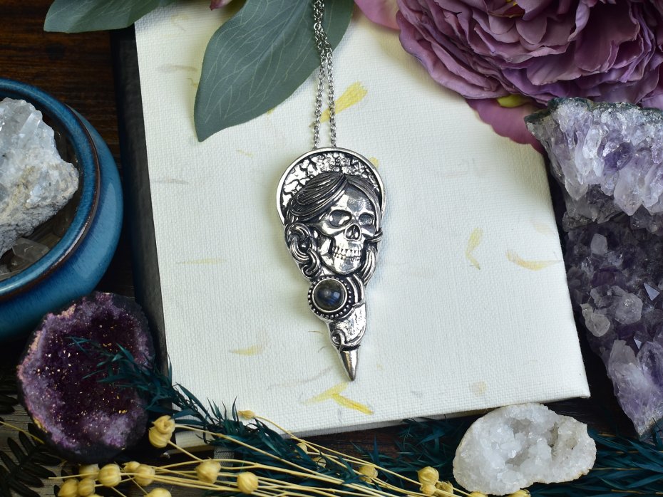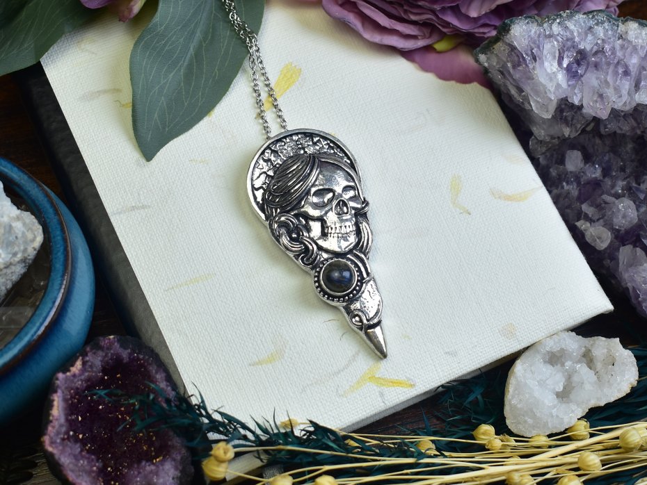 Posrebrzany wisiorek "Martwa Madonna" wykonany z miedzi, pokryty srebrem próby 925, z małym labradorytem. Wisiorek przedstawia kobietę-trupa z aureolą, łącząc elementy mistyczne i religijne w jednej kompozycji. Labradoryt dodaje subtelnego blasku i symbolizuje intuicję oraz ochronę. Całość tworzy niezwykle wyrafinowany i symboliczny projekt, który może stanowić głęboki wyraz refleksji nad miłością, śmiercią i duchowością. Idealny dla osób ceniących unikalne, artystyczne wyrażenie oraz głębokie znaczenie w biżuterii.