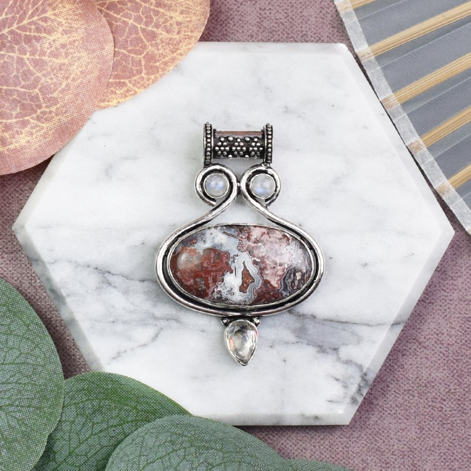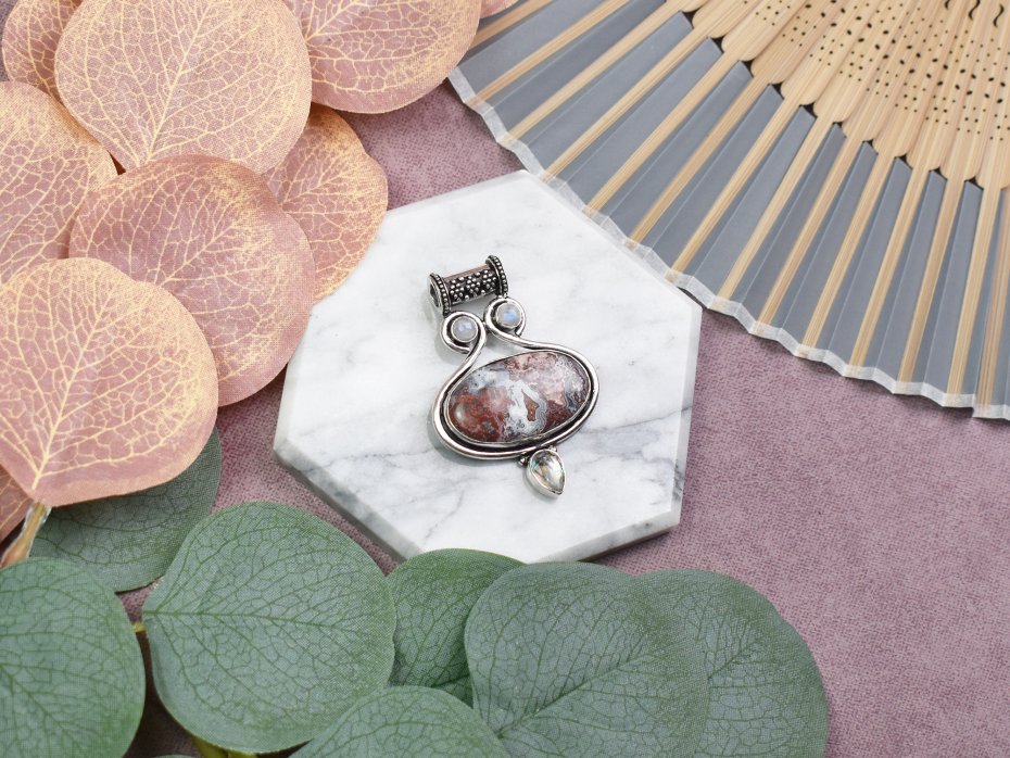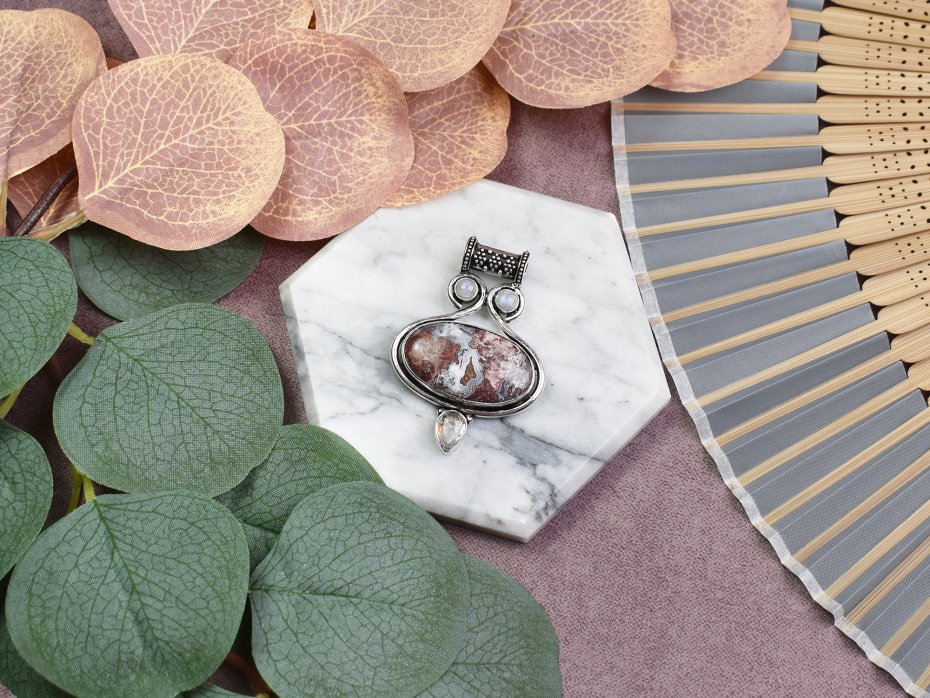 Ręcznie wykonany wisior z miedzi, pokryty srebrem próby 925, zdobiony agatem Crazy Lace, małymi kamieniami księżycowymi oraz syntetycznym białym topazem. Agat Crazy Lace, znany jako "kamień śmiechu", przynosi optymizm, radość i równowagę emocjonalną. Uważa się, że pomaga w łagodzeniu stresu i wspiera pozytywne nastawienie. Kamień księżycowy, symbol związku z intuicją i fazami życia, dodaje harmonii i duchowego spokoju. W połączeniu z białym topazem syntetycznym, który sprzyja jasności myślenia i wzmacnia wewnętrzną siłę, wisior ten oferuje zarówno piękno, jak i subtelne wsparcie energetyczne. To elegancki talizman, który może towarzyszyć w codziennych wyzwaniach, wspierając harmonię i optymizm.
