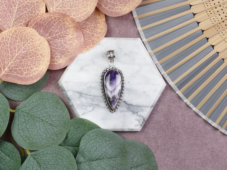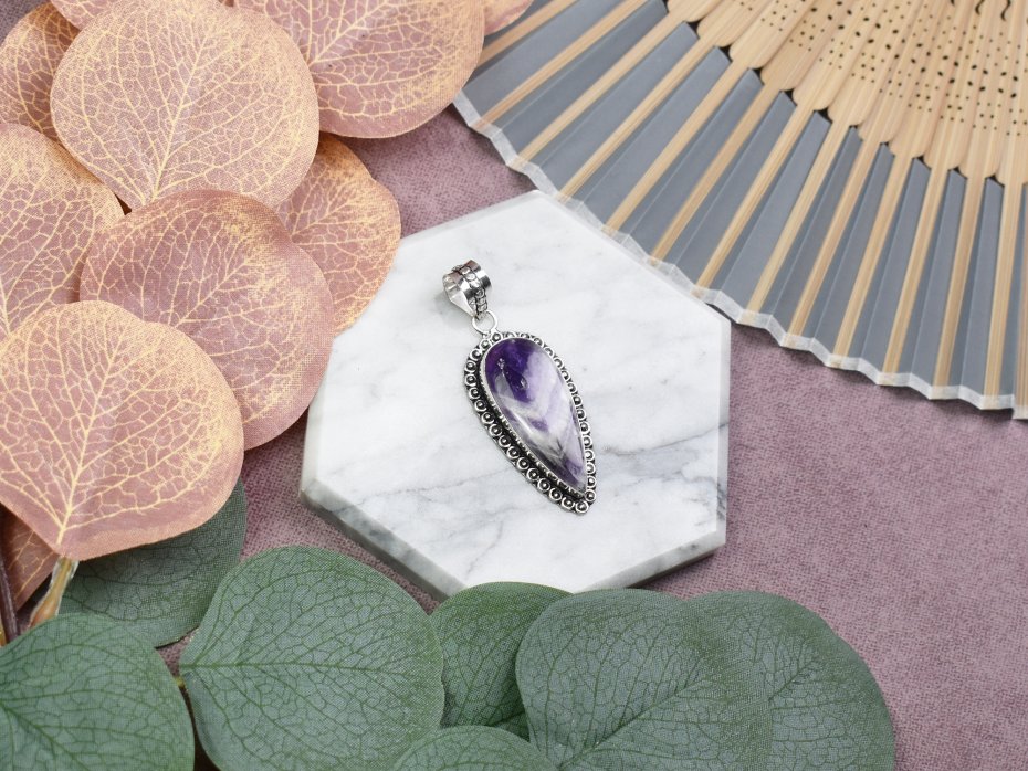 Wisiorek łączy w sobie elegancję srebra z głębokim kolorem ametystu, tworząc uniwersalny dodatek pasujący do różnych stylizacji.