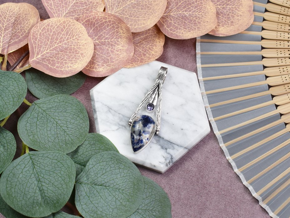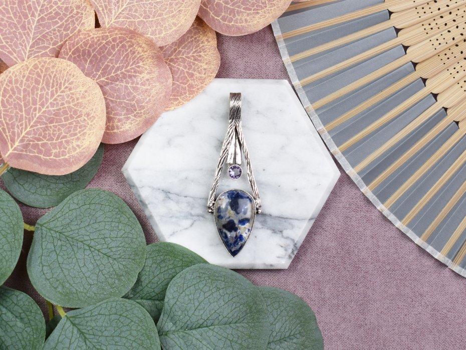 Ręcznie wykonany wisior z miedzi, pokryty srebrem próby 925, zdobiony sodalitem i małym ametystem. Sodalit jest kamieniem, który wspiera logiczne myślenie, wewnętrzny spokój oraz komunikację. Uważa się, że pomaga w wyrażaniu własnych myśli i emocji, sprzyjając jednocześnie rozwojowi duchowemu. Mały ametyst, znany z właściwości uspokajających, wzmacnia te cechy, dodając ochrony i równowagi emocjonalnej. Połączenie tych dwóch kamieni czyni wisior idealnym do noszenia na co dzień, jako wsparcie dla klarowności umysłu i duchowej harmonii.