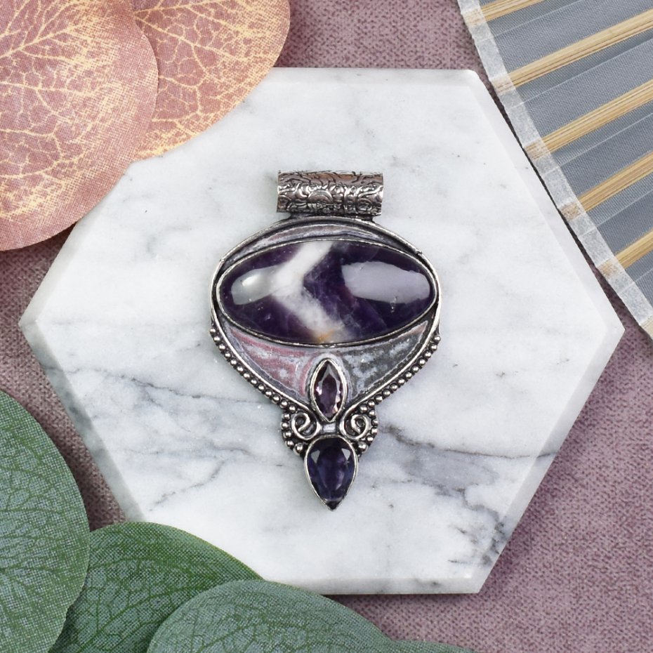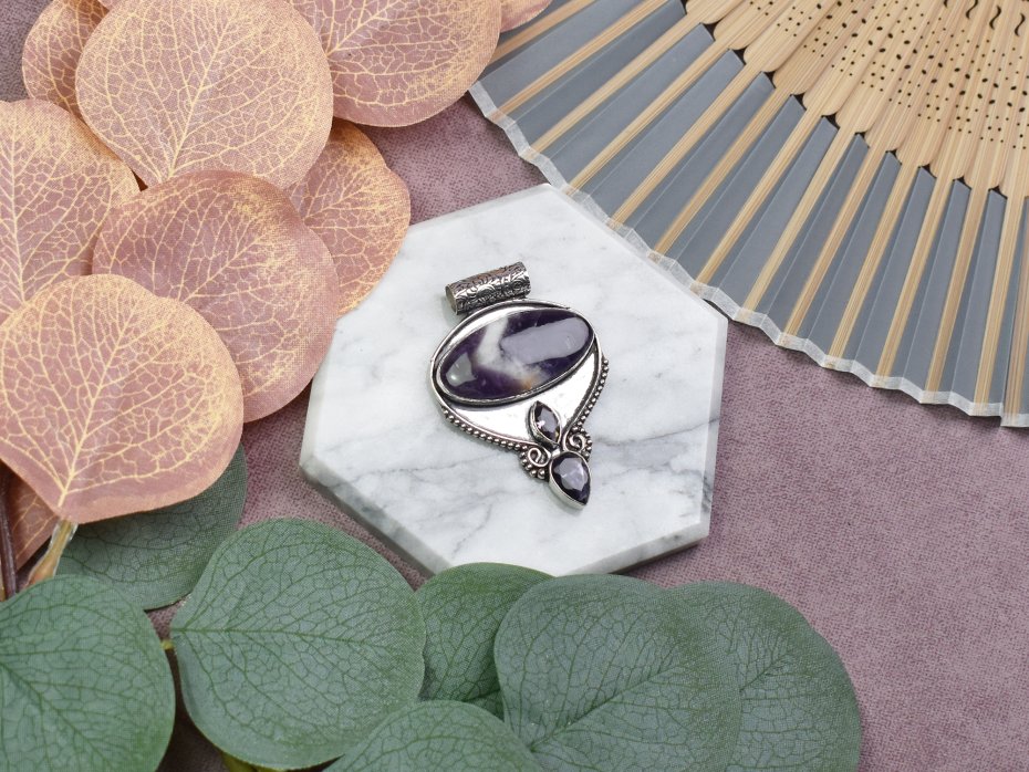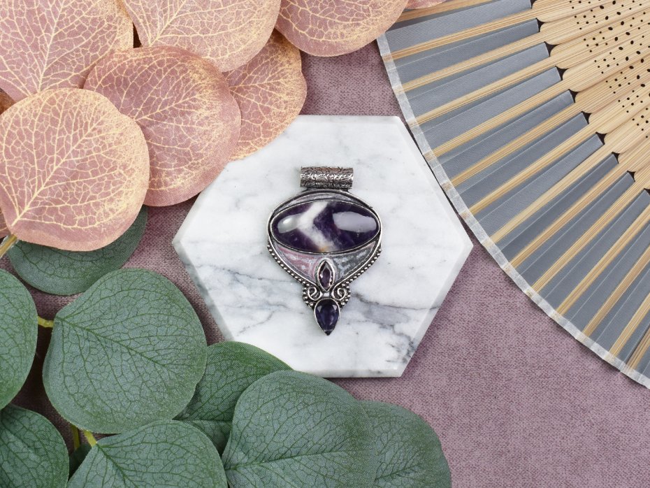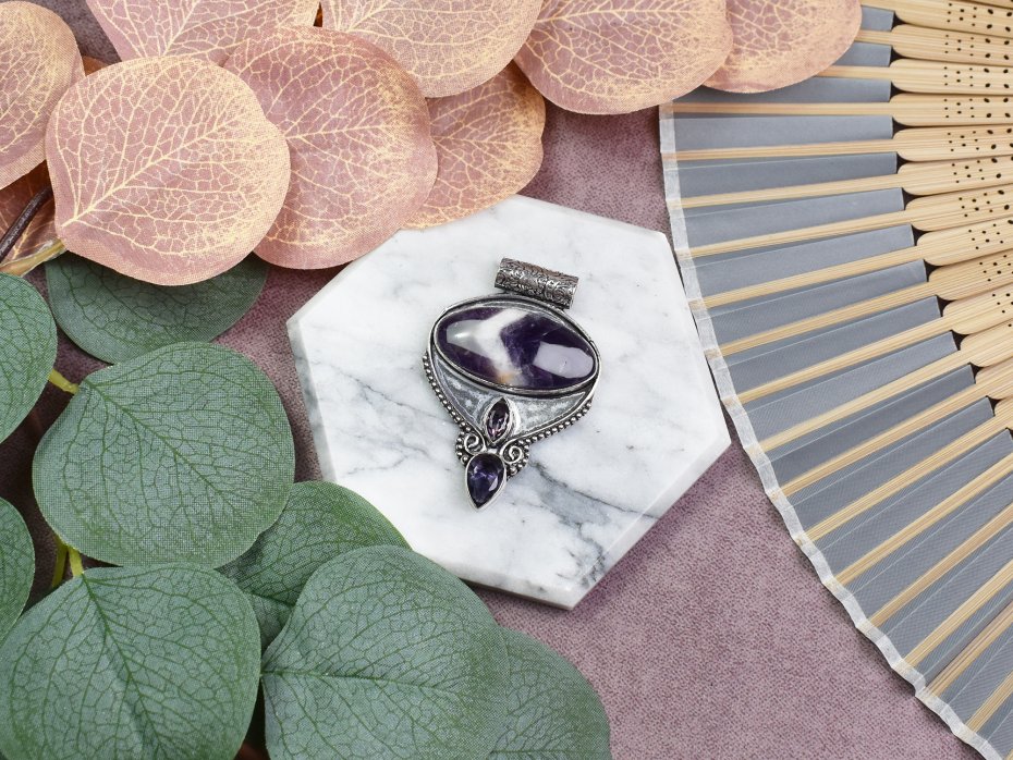 Ręcznie wykonany wisior z miedzi, pokryty srebrem próby 925, zdobiony ametystami. Ametyst, znany z właściwości ochronnych i uspokajających, jest często wybierany przez osoby poszukujące harmonii oraz wewnętrznego spokoju. Uważa się, że wspiera jasność umysłu, pomaga w medytacji oraz ułatwia zasypianie, chroniąc przed złymi snami. Kamień ten jest również kojarzony z duchowym wzrostem i równowagą emocjonalną. Noszenie ametystu może wspomagać koncentrację i przynosić ulgę w momentach stresu. Wisior ten, dzięki swojej prostocie i znaczeniu, może być zarówno eleganckim dodatkiem, jak i osobistym talizmanem wspierającym duchową stabilność.