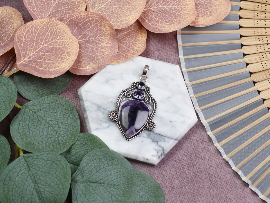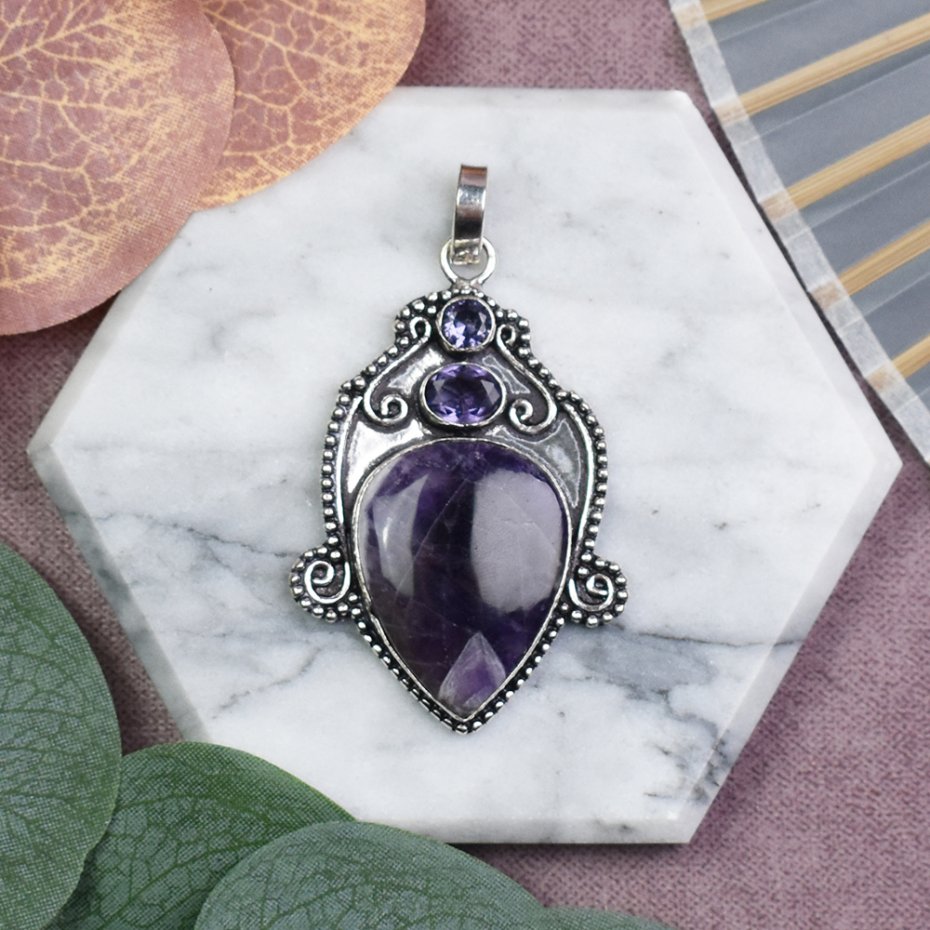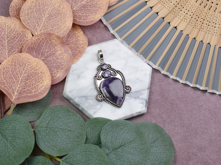 Ręcznie wykonany wisiorek z miedzi, pokryty srebrem próby 925, z jednym dużym ametystem oraz dwoma małymi ametystami. Ametyst jest kamieniem znanym z właściwości ochronnych, pomagającym w osiągnięciu wewnętrznego spokoju, równowagi emocjonalnej i klarowności umysłu. Duży ametyst stanowi centralny element, symbolizując duchowy rozwój i wyciszenie, a mniejsze kamienie wzmacniają jego działanie, dodając subtelnego uroku. Wisiorek ten jest idealnym talizmanem, wspierającym harmonię i pozytywne myślenie na co dzień.