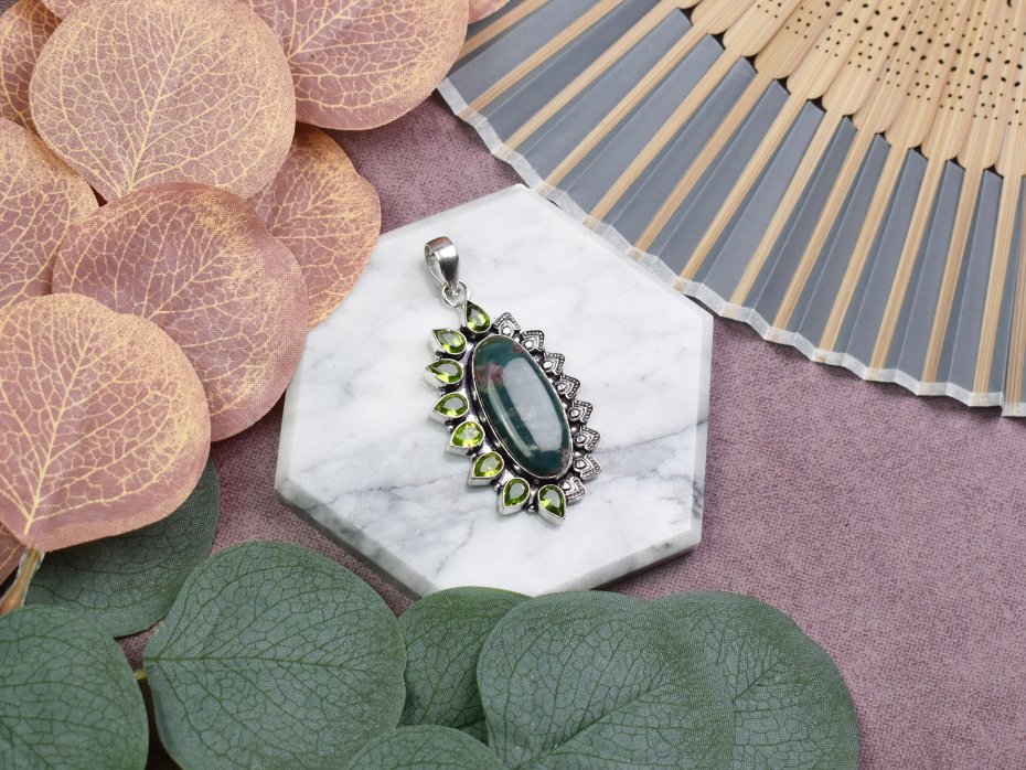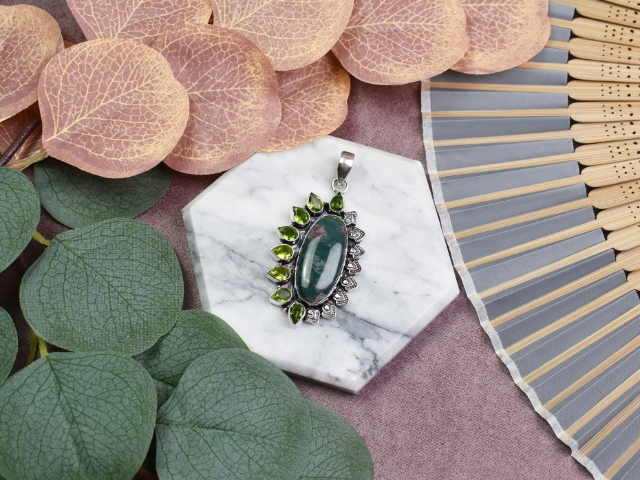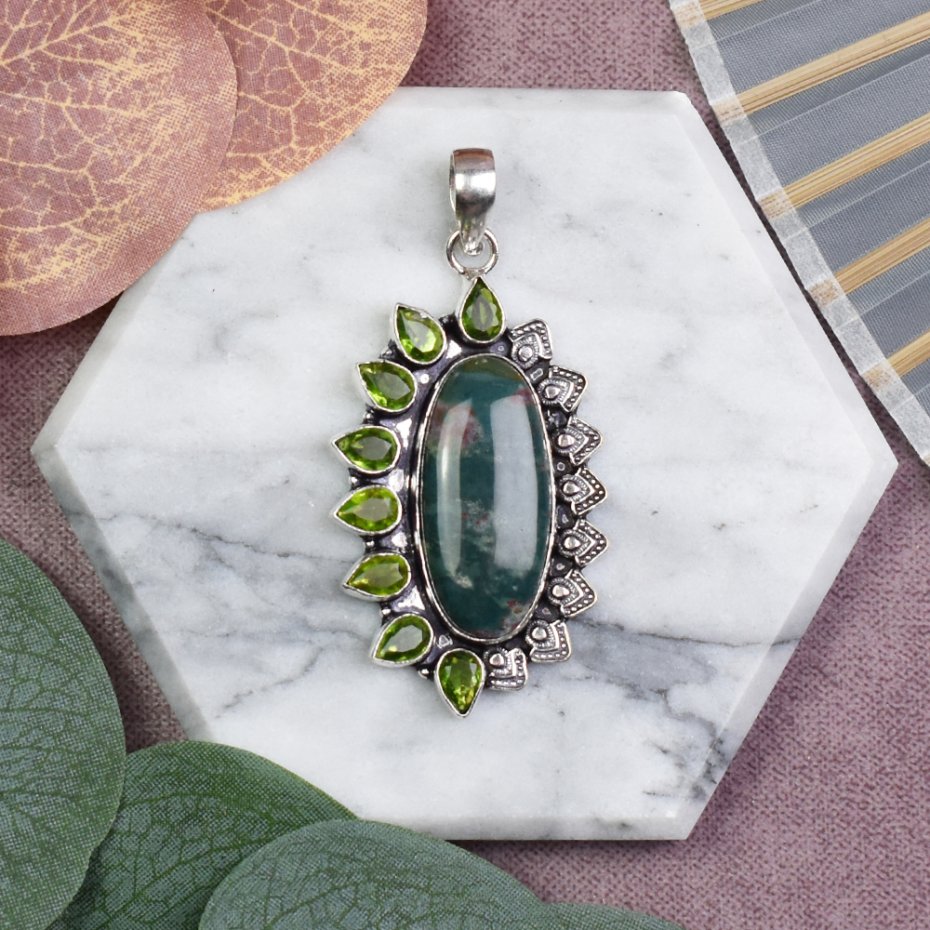 Ręcznie wykonany wisiorek z miedzi, pokryty srebrem próby 925, z dużym zielonym heliotropem (bloodstone) oraz ozdobną koroną z małych peridotów. Heliotrop, znany również jako bloodstone, to kamień ochrony i odwagi, pomagający w przezwyciężaniu trudności oraz wzmacniający siłę woli. Jest ceniony za swoje właściwości uziemiające i wspierające witalność. Ozdobna korona z małych peridotów dodaje wisiorkowi lekkości i harmonii, sprzyjając regeneracji oraz równowadze emocjonalnej. To wyjątkowy talizman, łączący energię ochrony, siły i odnowy, idealny do noszenia na co dzień.