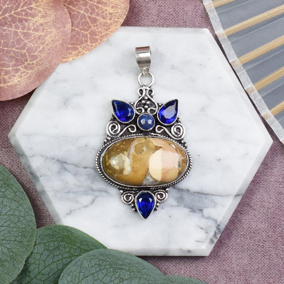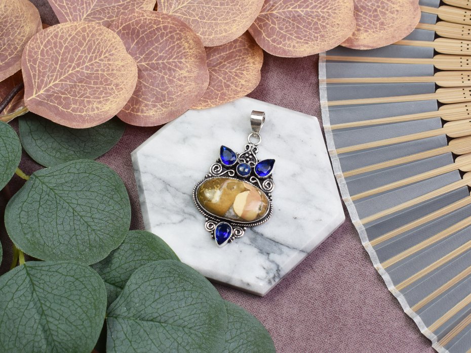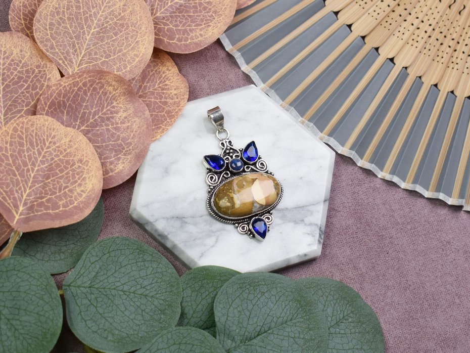 Ręcznie wykonany wisiorek z miedzi, pokryty srebrem próby 925, z dużym żółtym jaspisem oraz trzema syntetycznymi tanzanitami. Żółty jaspis to kamień znany ze swoich właściwości wspierających siłę woli, pewność siebie oraz ochronę przed negatywnymi energiami. Wspomaga wewnętrzną stabilność i wytrwałość. Syntetyczne tanzanity, z ich głęboką, niebiesko-fioletową barwą, symbolizują duchowy wzrost, intuicję oraz jasność myśli. Połączenie ciepłej energii jaspisu i duchowego wsparcia tanzanitów tworzy wisiorek, który wspomaga równowagę emocjonalną, pewność siebie i duchową harmonię.