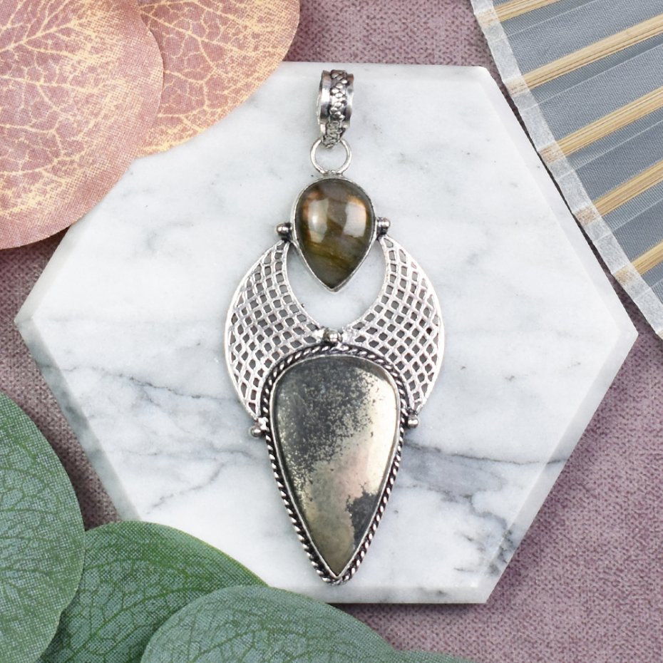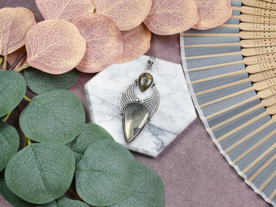 Elegancki wisiorek z miedzi, delikatnie pokryty srebrem, to niepowtarzalna ozdoba, której centralnym punktem są kamienie - pirot i labradoryt. Piryt dodaje mu subtelnego blasku, symbolizując nie tylko piękno, lecz także ochronę i pewność siebie. Labradoryt natomiast emanuje tajemniczym światłem, uznawanym za kamień intuicji, wspierający kreatywność i równowagę emocjonalną. To nie tylko biżuteria, lecz również talizman, łączący estetykę z pozytywnymi energiami kamieni naturalnych.