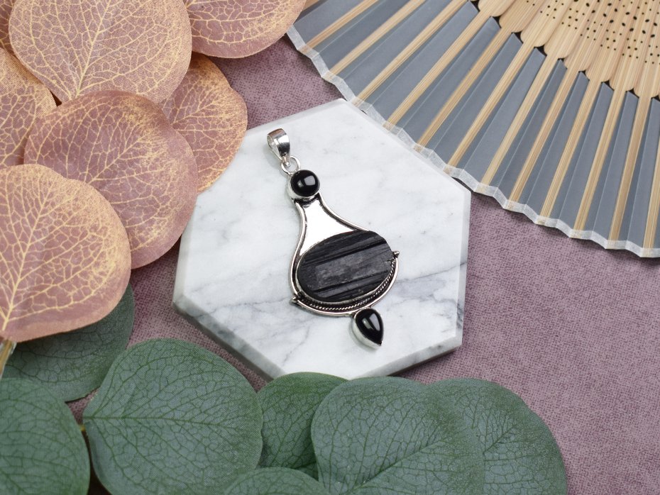 Ręcznie wykonany wisiorek z miedzi, pokryty srebrem próby 925, z dużym surowym turmalinem oraz dwoma małymi onyksami. Surowy turmalin jest znany ze swoich silnych właściwości ochronnych, pomagając w oczyszczaniu negatywnych energii i uziemieniu. Wspiera równowagę emocjonalną oraz siłę wewnętrzną. Onyks, często kojarzony z mocą i determinacją, wzmacnia poczucie stabilności i wytrwałości. W połączeniu te kamienie tworzą wisiorek, który oferuje silną ochronę oraz wsparcie duchowe, idealny dla osób poszukujących wewnętrznej równowagi i spokoju.