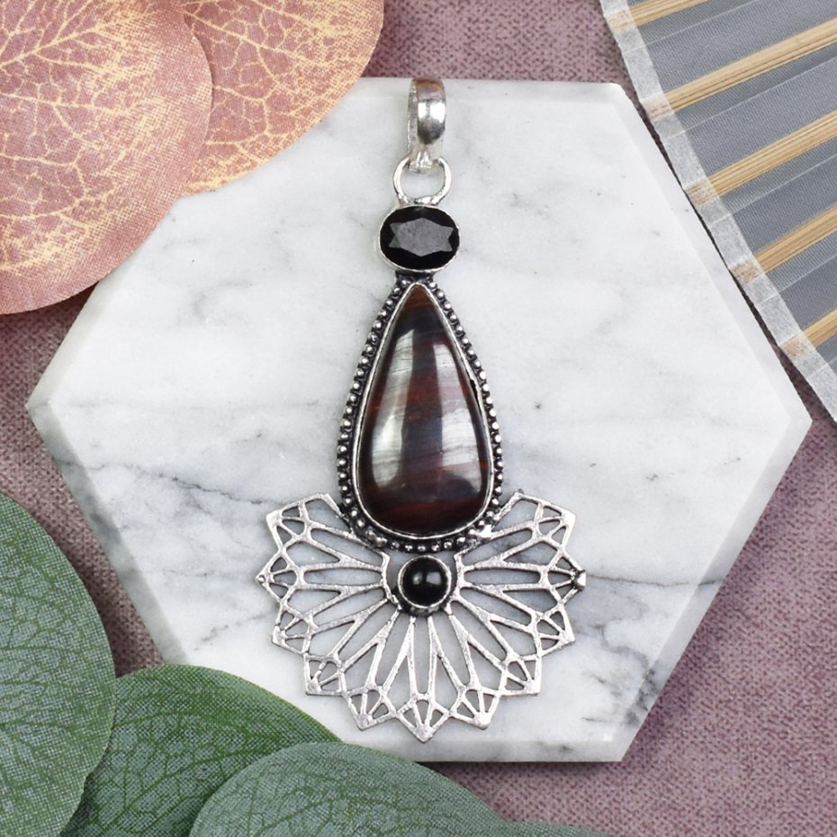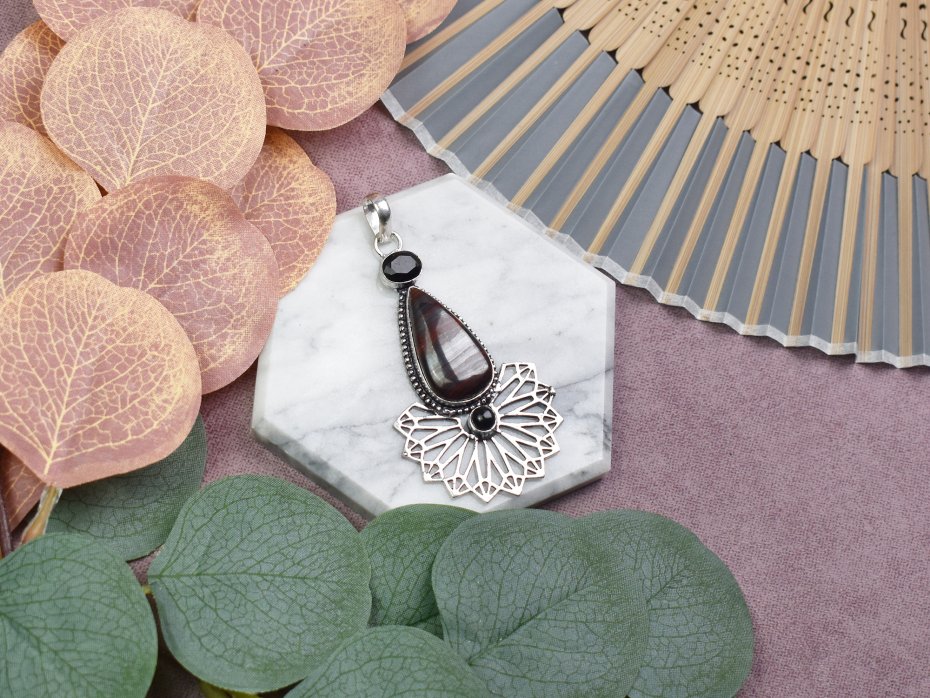 Ręcznie wykonany wisiorek z miedzi, pokryty srebrem próby 925. Cała powierzchnia wisiorka została starannie zabezpieczona srebrem, dzięki czemu żadne elementy miedziane nie są widoczne. W centrum kompozycji znajduje się kamień tygrysie oko oraz onyks.