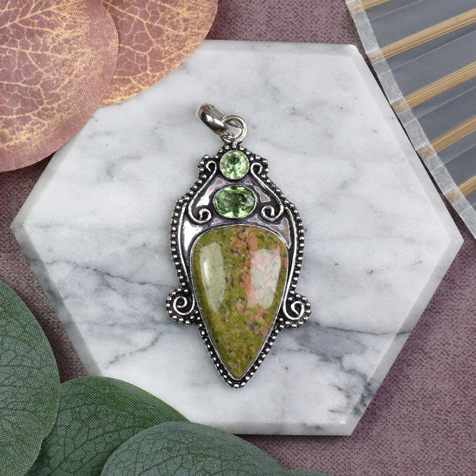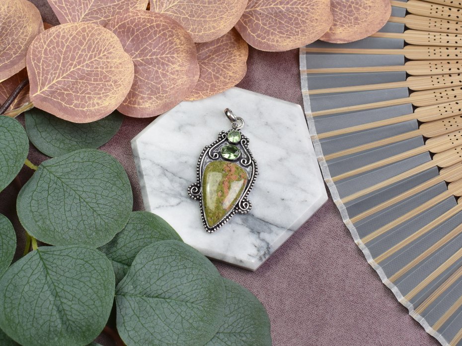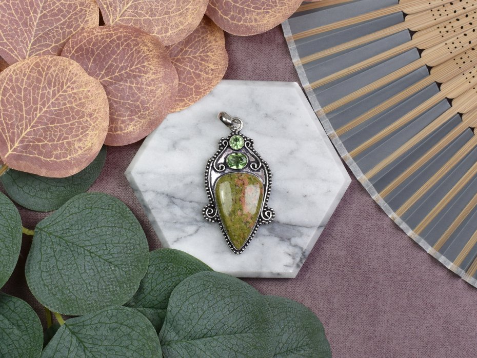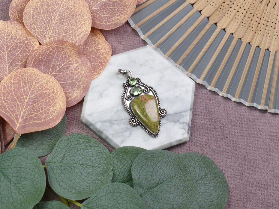 Ręcznie wykonany wisior z miedzi, pokryty srebrem próby 925, zdobiony unakitem i peridotem. Unakit to kamień, który łączy w sobie energię zielonego epidotu i różowego feldu, co symbolizuje harmonię i równowagę. Uważa się, że wspiera rozwój osobisty, pomagając w przezwyciężaniu przeszłych traum i emocjonalnych blokad. Kamień ten jest często wybierany przez osoby poszukujące uzdrowienia wewnętrznego. Peridot, znany również jako oliwin, to kamień o silnych właściwościach oczyszczających. Pomaga w uwalnianiu negatywnych emocji, wspiera regenerację i przyciąga pozytywną energię. Wisior ten łączy w sobie symbolikę uzdrawiania i odnowy, idealny do noszenia jako codzienny talizman wspierający spokój i równowagę emocjonalną.