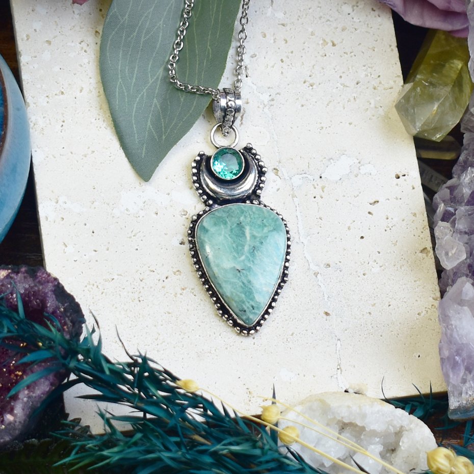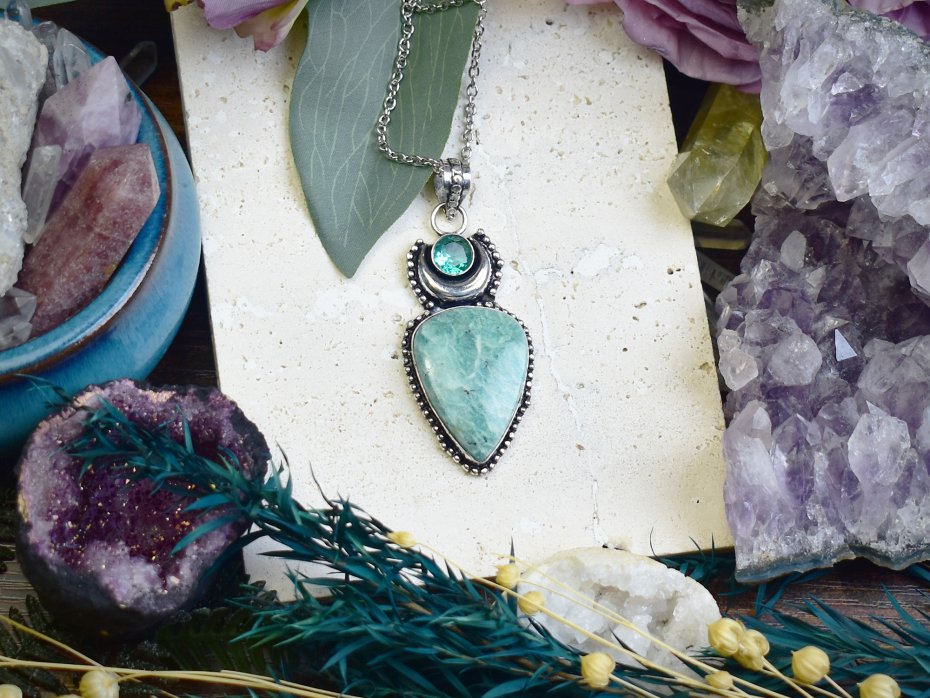 Ręcznie wykonany wisiorek z amazonitem i apatytem, stworzony tradycyjnymi technikami z miedzi, a następnie posrebrzony. Amazonit, znany jako kamień harmonii, wspiera równowagę emocjonalną, podczas gdy apatyt pobudza kreatywność i wewnętrzną siłę. Unikalne połączenie minerałów i rzemieślniczej precyzji tworzy amulet sprzyjający spokoju, inspiracji i pewności siebie.