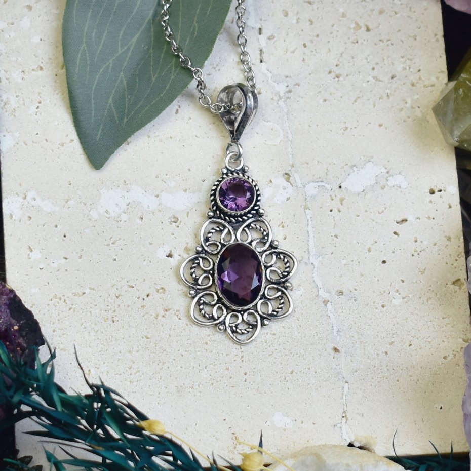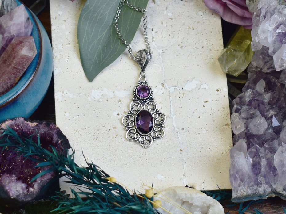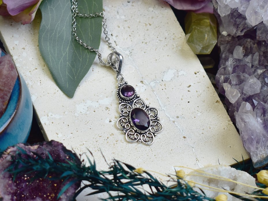 Ręcznie wykonany wisiorek z ametystem, powstały tradycyjnymi technikami z miedzi, a następnie pokryty srebrem. Ametyst, ceniony za swoje właściwości harmonizujące, od wieków symbolizuje spokój i wewnętrzną równowagę. Srebro nadaje biżuterii elegancki charakter, a unikalny wzór sprawia, że jest wyjątkowym dodatkiem i osobistym talizmanem.
