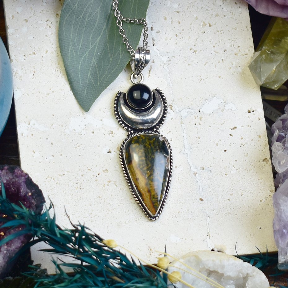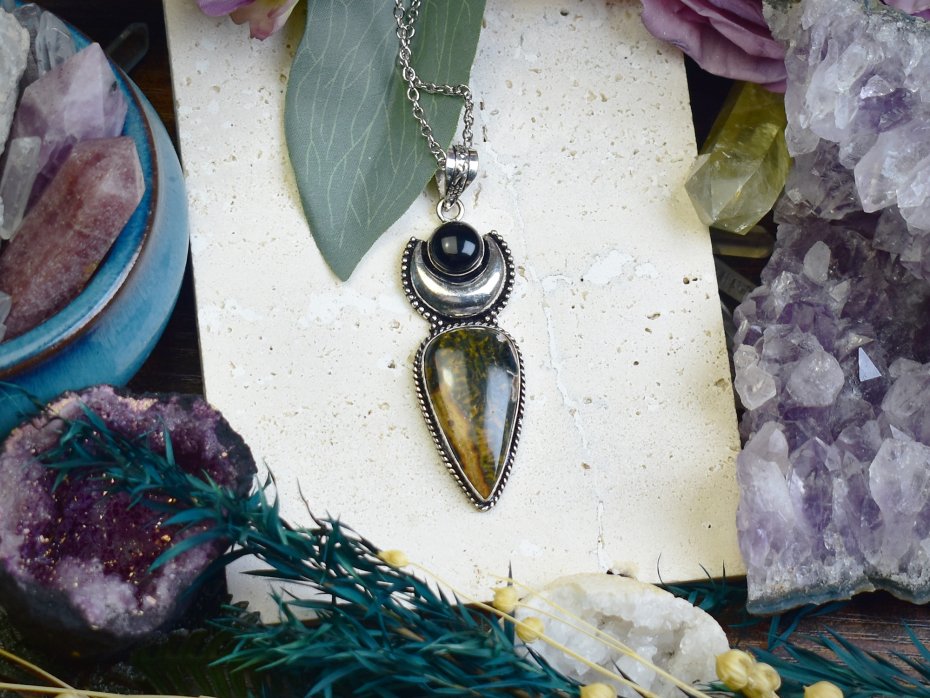 Ręcznie wykonany wisiorek z jaspisem oceanicznym i onyksem, stworzony tradycyjnymi metodami z miedzi, a następnie pokryty srebrem. Jaspis oceaniczny zachwyca unikalnym wzorem inspirowanym naturą, a onyks dodaje mu głębi i tajemniczego charakteru. Biżuteria dla osób ceniących oryginalne wzornictwo i symboliczne znaczenie kamieni.