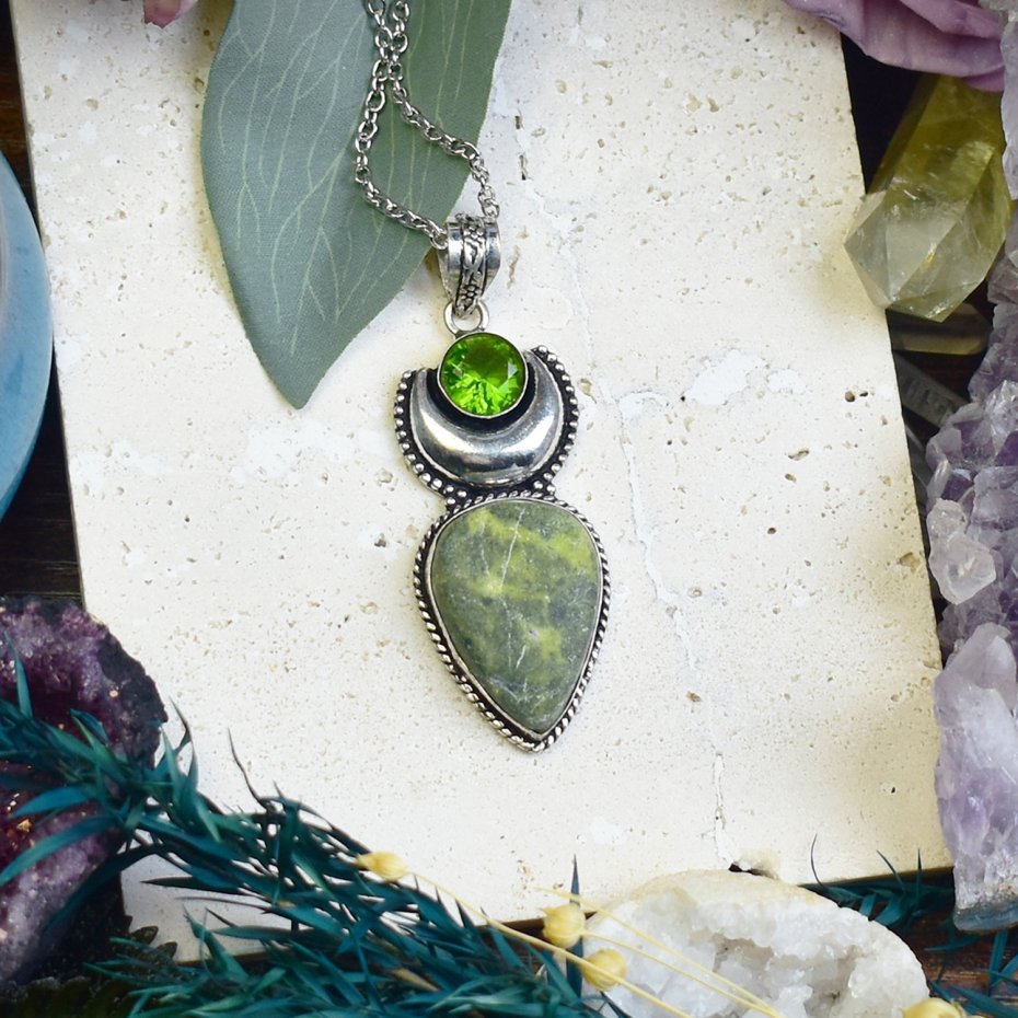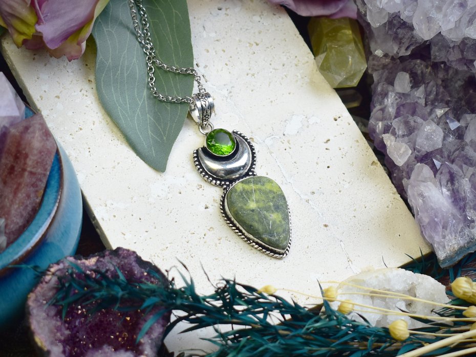 Ręcznie wykonany wisiorek z miedzi, później posrebrzony, ozdobiony zielonym jaspisem stichtitem i peridotem. Naturalne kamienie tworzą harmonijną kompozycję barw i faktur. Jaspis symbolizuje stabilność, stichtit pomaga w wewnętrznej transformacji, a peridot wnosi energię odnowy. Tradycyjna metoda wykonania nadaje mu niepowtarzalny charakter, łącząc surowość metalu z subtelnym blaskiem srebra. Idealny dla osób ceniących unikalną biżuterię z symbolicznym znaczeniem.