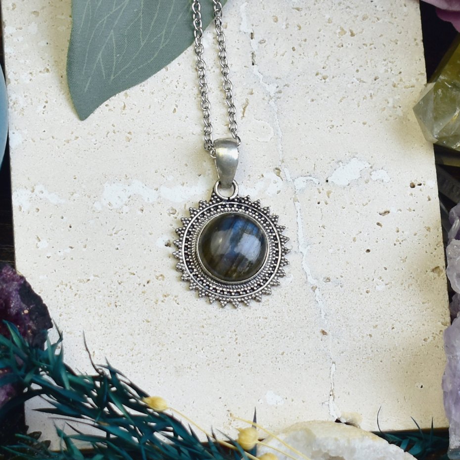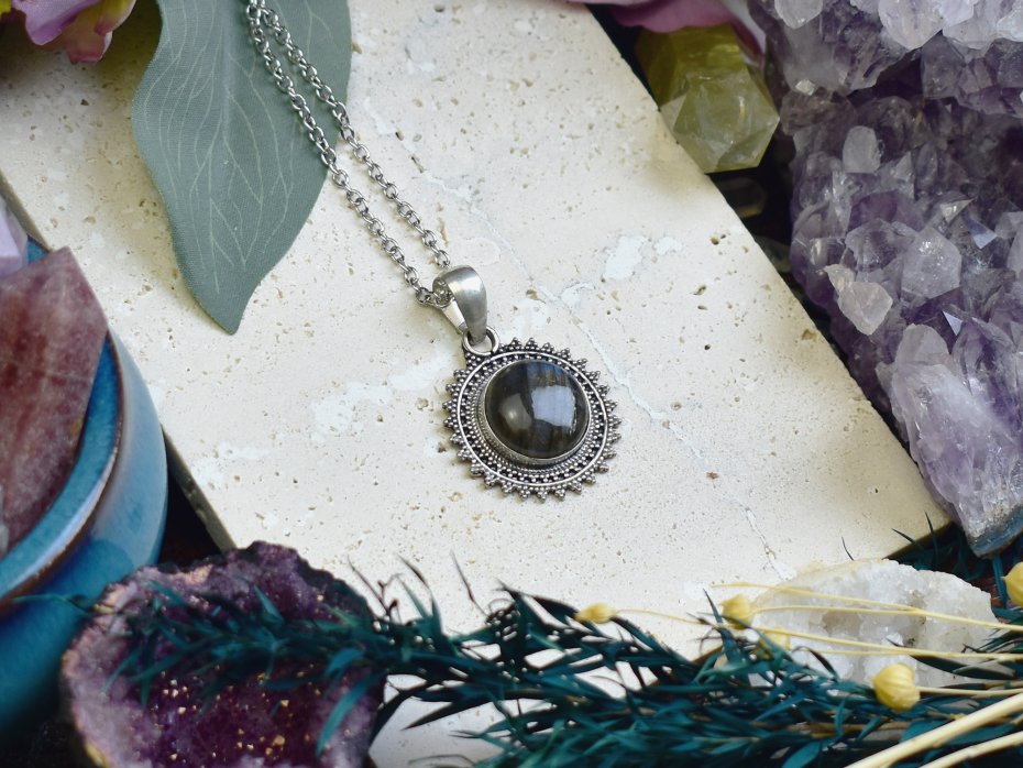 Ręcznie wykonany wisiorek z labradorytem, stworzony tradycyjnymi technikami z miedzi i pokryty warstwą srebra. Labradoryt, znany ze swojej opalizującej gry barw, symbolizuje wewnętrzną siłę, intuicję i ochronę przed negatywną energią. Ten unikalny amulet łączy w sobie surowość rzemiosła z mistycznym blaskiem kamienia, tworząc wyjątkową ozdobę dla osób ceniących oryginalne dodatki o głębszej symbolice.
