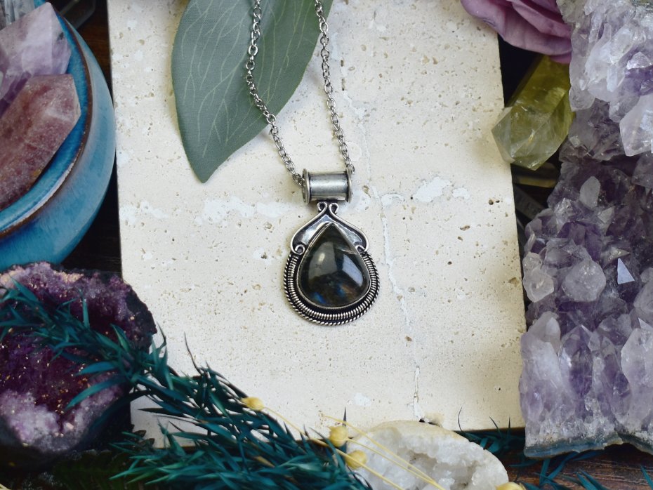 Ręcznie wykonany wisiorek z labradorytem, stworzony tradycyjnymi technikami z miedzi i pokryty warstwą srebra. Labradoryt, znany ze swojej opalizującej gry barw, symbolizuje wewnętrzną siłę, intuicję i ochronę przed negatywną energią. Ten unikalny amulet łączy w sobie surowość rzemiosła z mistycznym blaskiem kamienia, tworząc wyjątkową ozdobę dla osób ceniących oryginalne dodatki o głębszej symbolice.