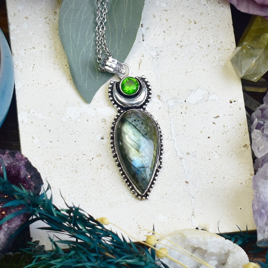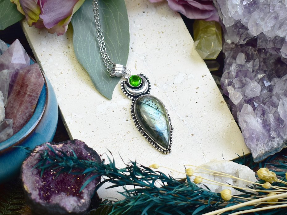 Ręcznie wykonany wisiorek z labradorytem i peridotem, powstały tradycyjnymi metodami z miedzi, a następnie pokryty srebrem. Labradoryt zachwyca swoją migotliwą poświatą, a peridot dodaje mu lekkości i blasku. Połączenie tych kamieni tworzy harmonijną kompozycję, przyciągającą pozytywną energię i równowagę.