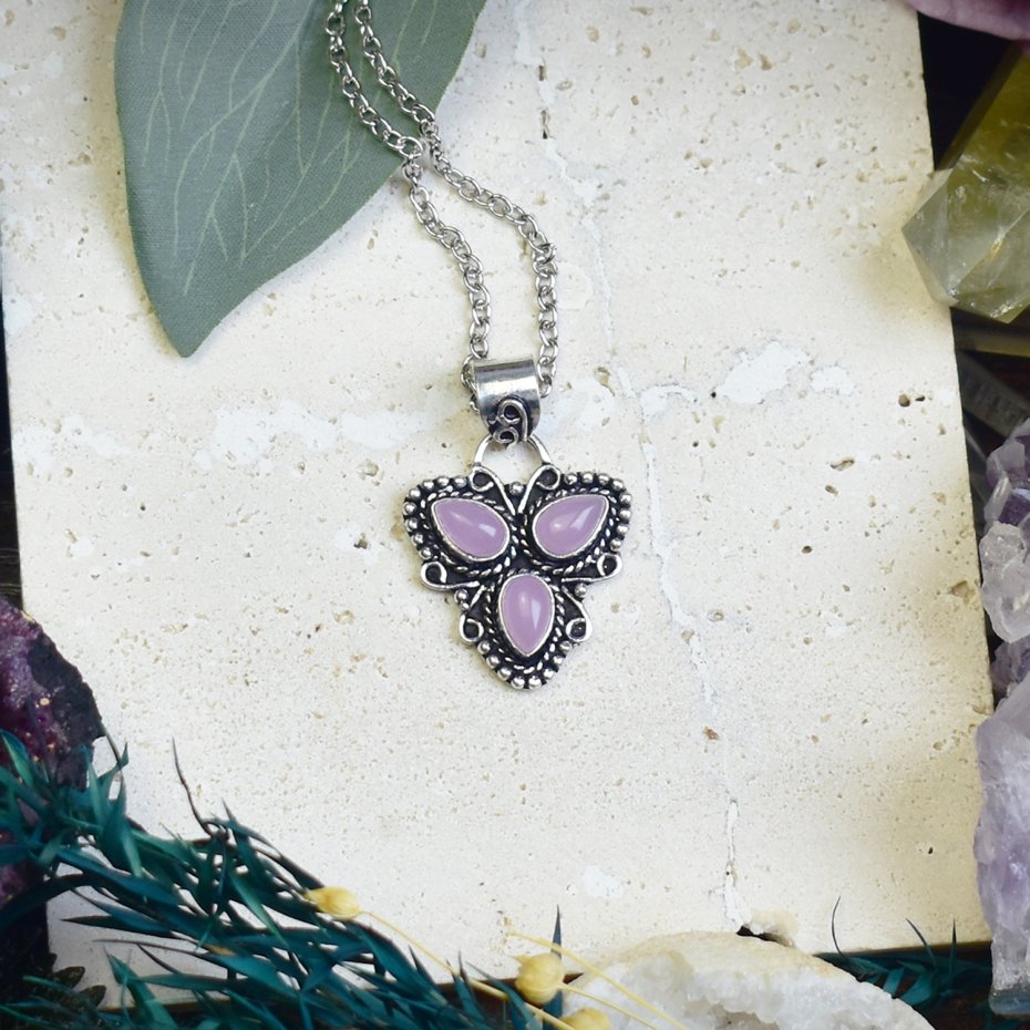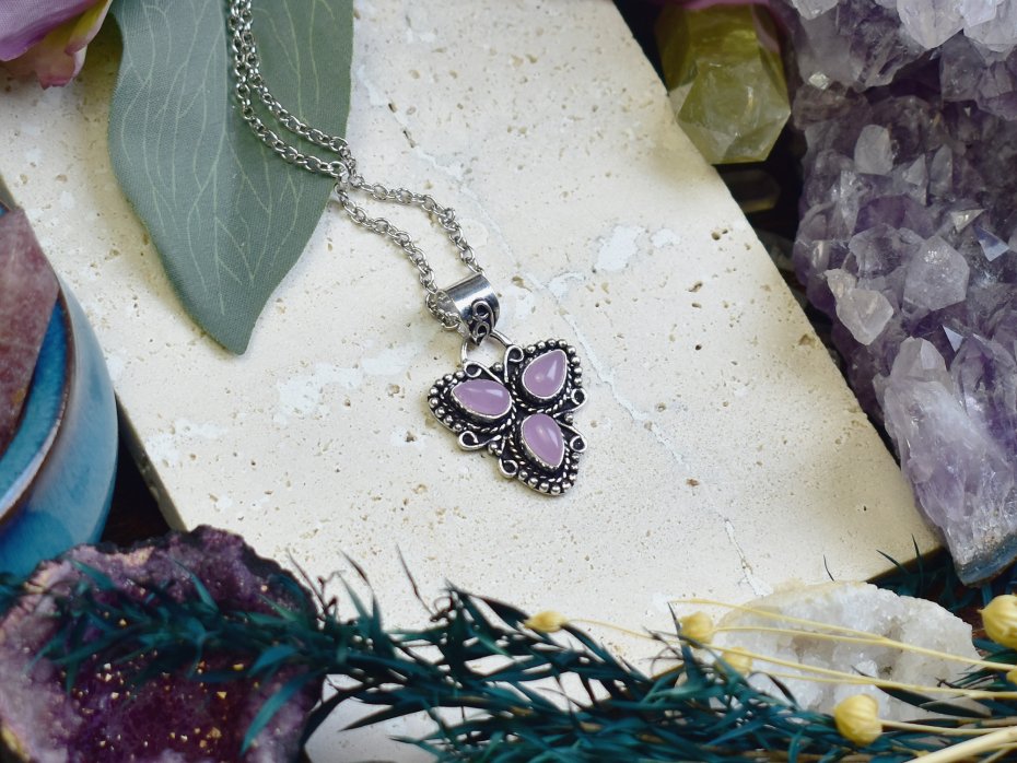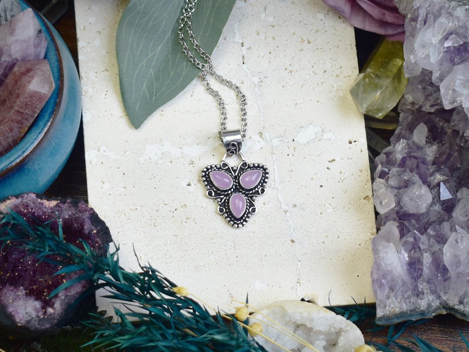 Ręcznie wykonany wisiorek z różowym chalcedonem, stworzony tradycyjnymi metodami z miedzi, a następnie posrebrzony. Kamień o subtelnej barwie symbolizuje spokój, harmonię i wewnętrzną siłę. Uważa się, że wspiera równowagę emocjonalną i łagodzi napięcie. Unikalne połączenie naturalnego minerału i rzemiosła artystycznego sprawia, że to nie tylko ozdoba, ale także amulet niosący pozytywną energię i ukojenie.