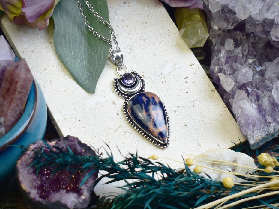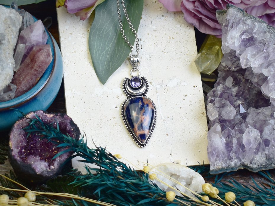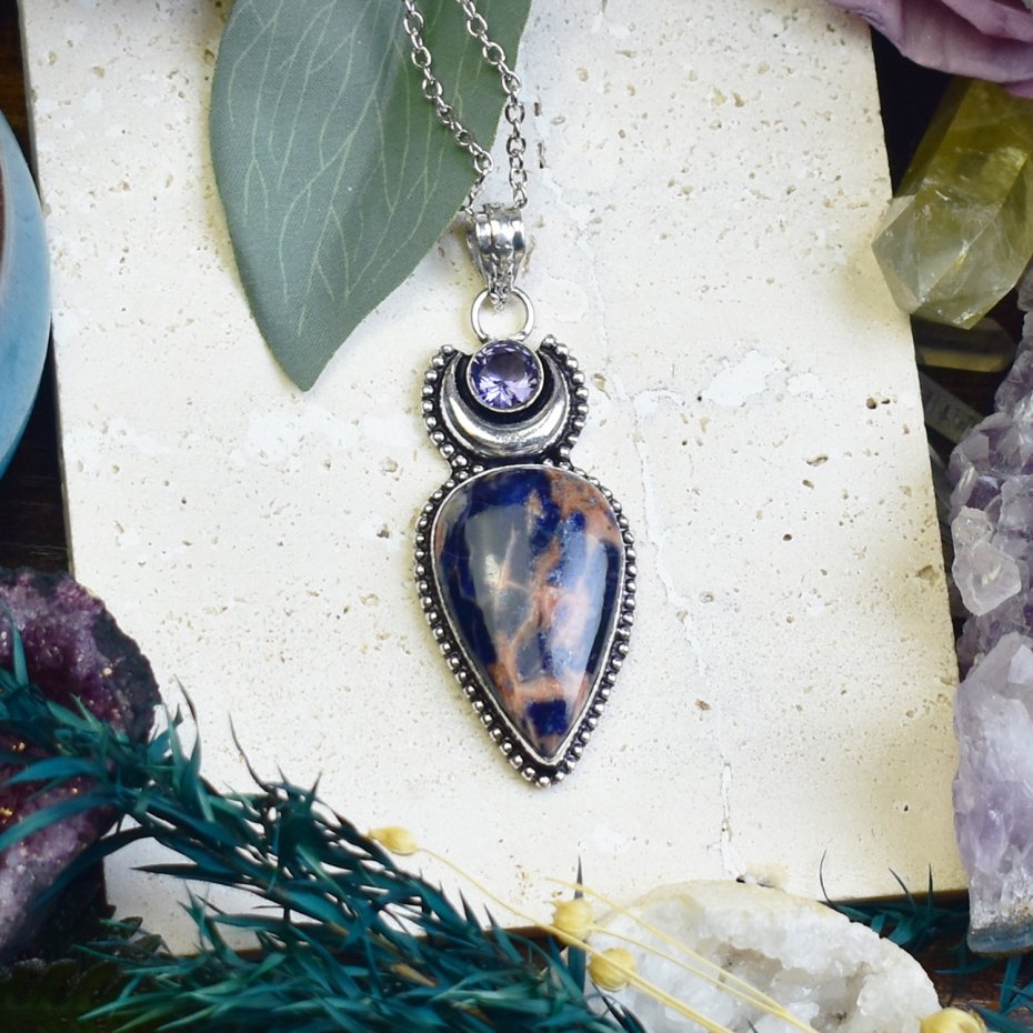 Ręcznie wykonany wisiorek z sodalitem i ametystem, stworzony tradycyjnymi metodami z miedzi, a następnie posrebrzony. Sodalit, kamień intuicji i wewnętrznej mądrości, harmonijnie łączy się z ametystem, który wspiera spokój i duchowy rozwój. Unikalny talizman łączący symbolikę minerałów z klasycznym rzemiosłem.