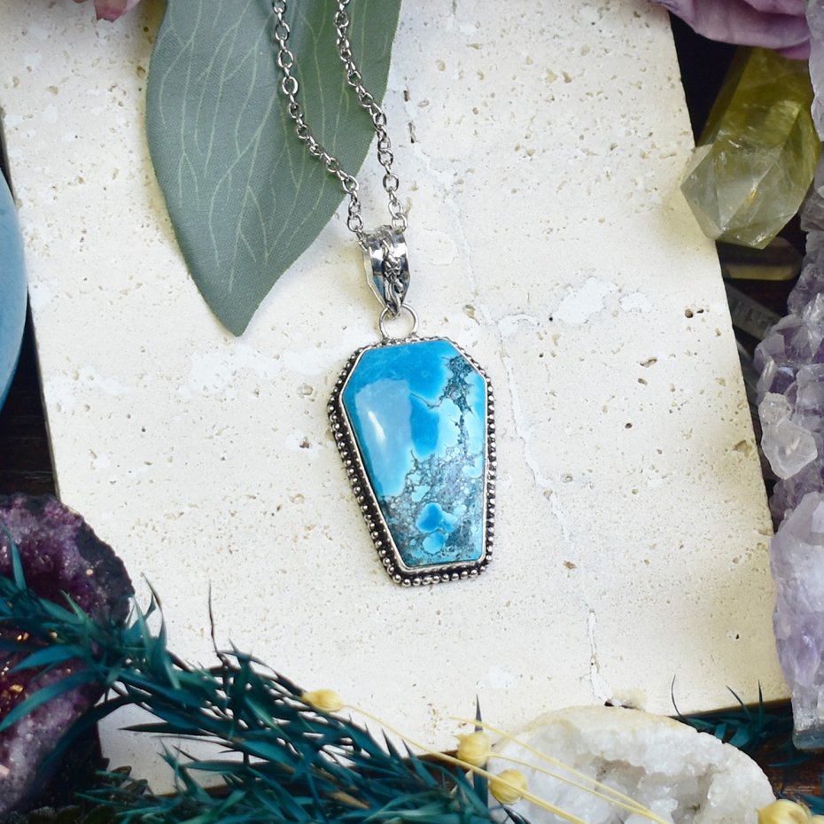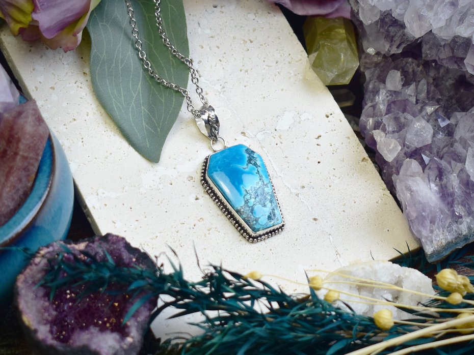 Oryginalny wisiorek z turkusem w kształcie trumny, wykonany z miedzi tradycyjnymi metodami, a następnie posrebrzony. Turkus od wieków kojarzony jest z ochroną, mądrością i wewnętrznym spokojem. Unikalne wzornictwo i surowa estetyka nadają mu wyjątkowy charakter, czyniąc go nie tylko ozdobą, ale i osobistym talizmanem.