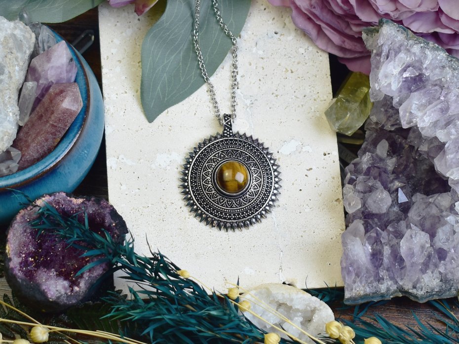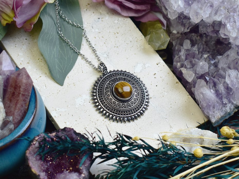 Ręcznie wykonany wisiorek z tygrysim okiem, stworzony z miedzi przy użyciu tradycyjnych technik, a następnie posrebrzony. Tygrysie oko to minerał kojarzony z siłą, odwagą i wewnętrzną równowagą. Pomaga skupić myśli, zwiększa pewność siebie i chroni przed negatywną energią. Jego ciepłe, złoto-brązowe refleksy nadają biżuterii wyjątkowy charakter. Połączenie naturalnego kamienia z rzemieślniczym kunsztem sprawia, że wisiorek jest zarówno stylową ozdobą, jak i osobistym amuletem.