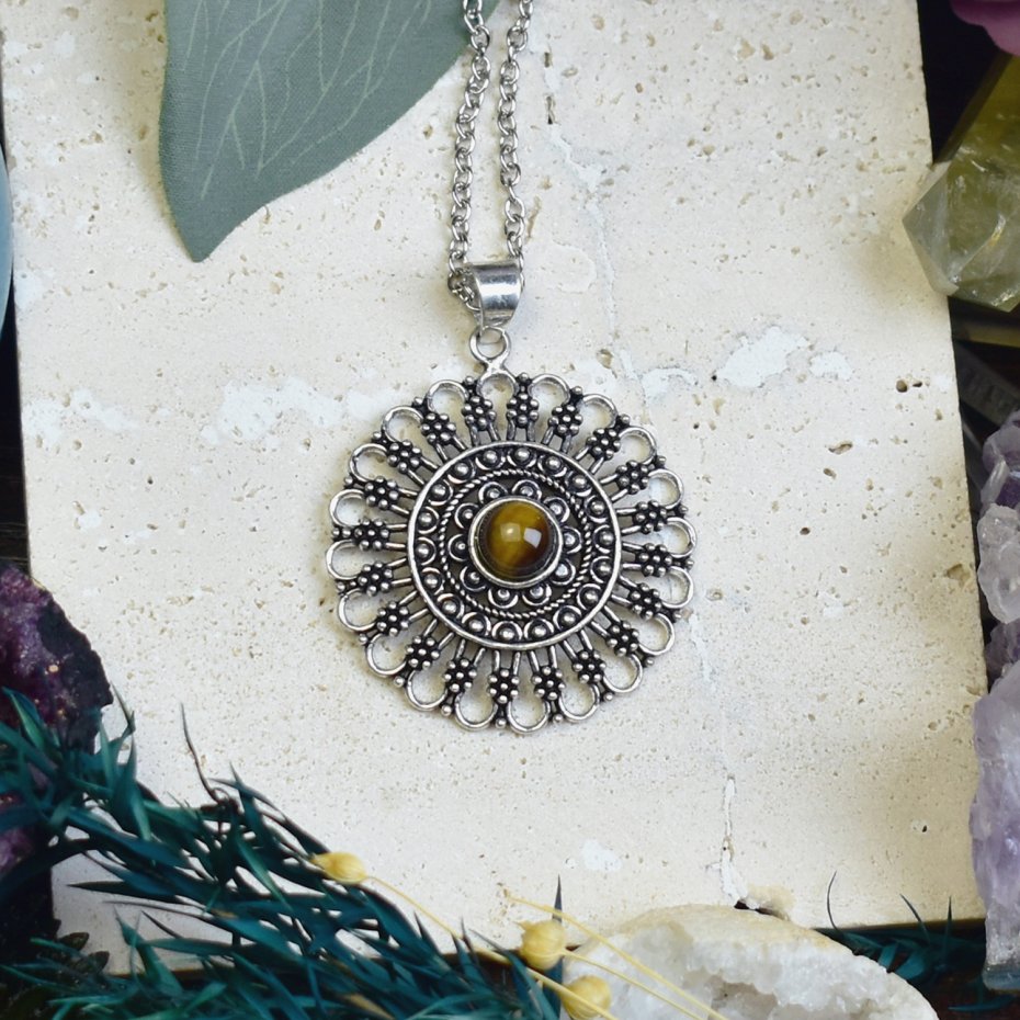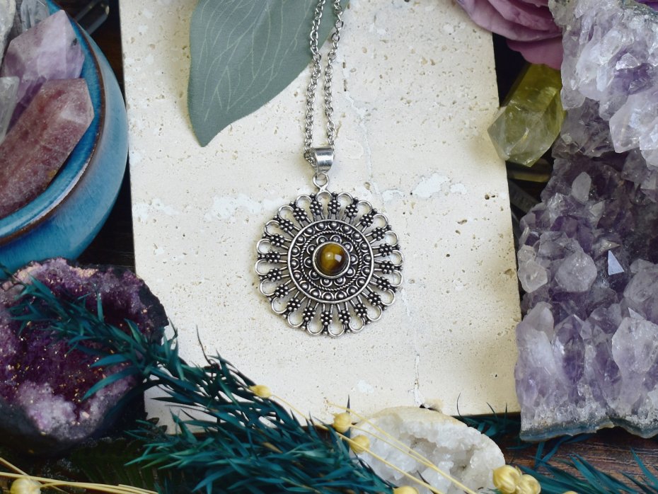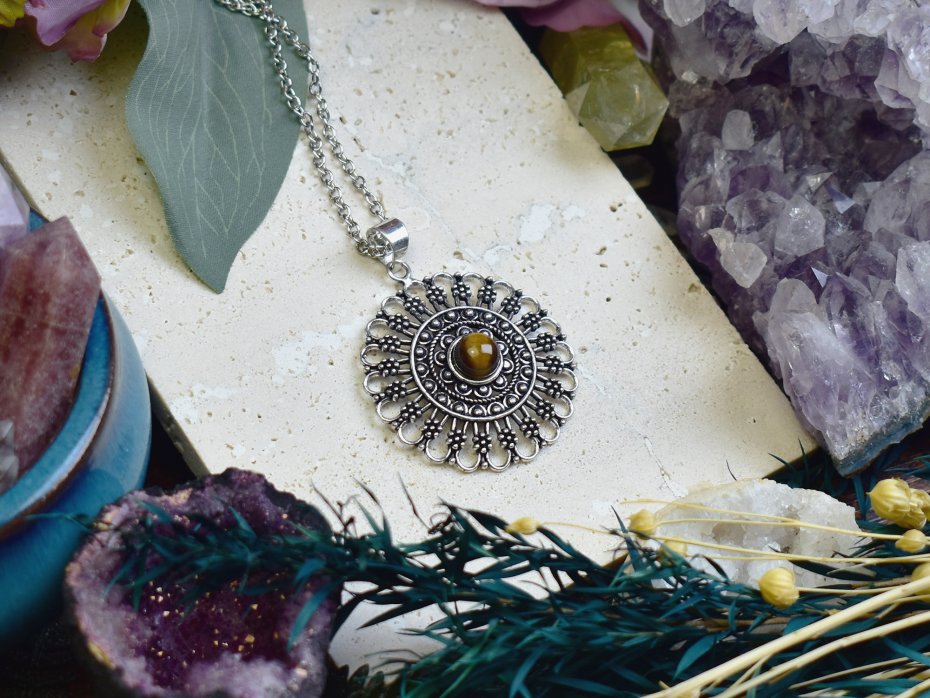 Ręcznie wykonany wisiorek z tygrysim okiem, stworzony z miedzi przy użyciu tradycyjnych technik, a następnie posrebrzony. Tygrysie oko to minerał kojarzony z siłą, odwagą i wewnętrzną równowagą. Pomaga skupić myśli, zwiększa pewność siebie i chroni przed negatywną energią. Jego ciepłe, złoto-brązowe refleksy nadają biżuterii wyjątkowy charakter. Połączenie naturalnego kamienia z rzemieślniczym kunsztem sprawia, że wisiorek jest zarówno stylową ozdobą, jak i osobistym amuletem.