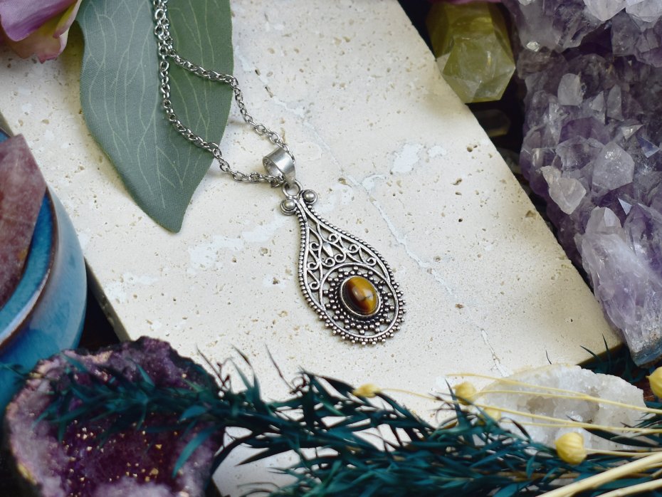 Ręcznie wykonany wisiorek z tygrysim okiem, stworzony z miedzi przy użyciu tradycyjnych technik, a następnie posrebrzony. Tygrysie oko to minerał kojarzony z siłą, odwagą i wewnętrzną równowagą. Pomaga skupić myśli, zwiększa pewność siebie i chroni przed negatywną energią. Jego ciepłe, złoto-brązowe refleksy nadają biżuterii wyjątkowy charakter. Połączenie naturalnego kamienia z rzemieślniczym kunsztem sprawia, że wisiorek jest zarówno stylową ozdobą, jak i osobistym amuletem.