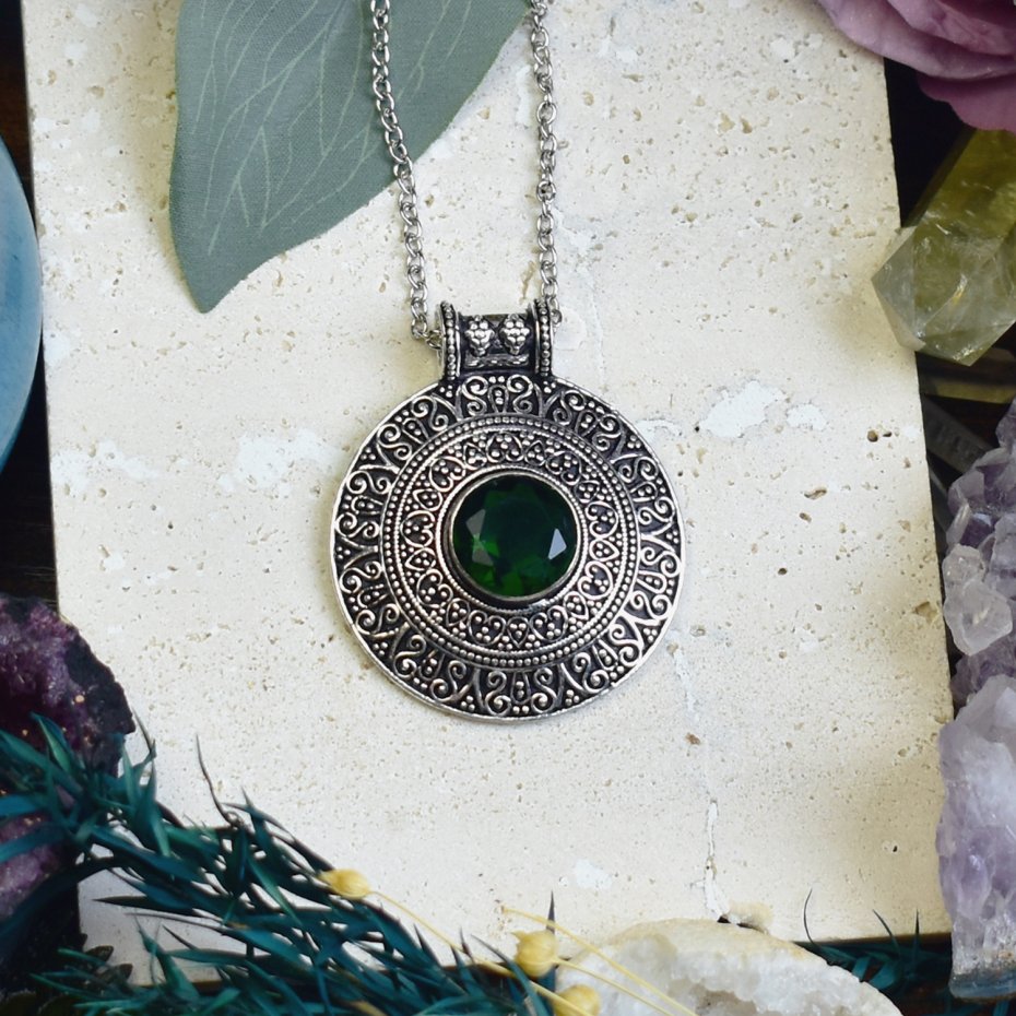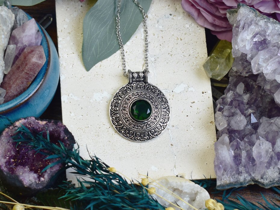 Ręcznie wykonany wisiorek z zielonym kwarcem, stworzony tradycyjnymi technikami z miedzi i pokryty srebrem. Zielony kwarc to kamień harmonii i odnowy, wspierający spokój wewnętrzny i pozytywną energię. Subtelny design podkreśla naturalne piękno minerału, czyniąc biżuterię wyjątkowym talizmanem o symbolicznym znaczeniu.