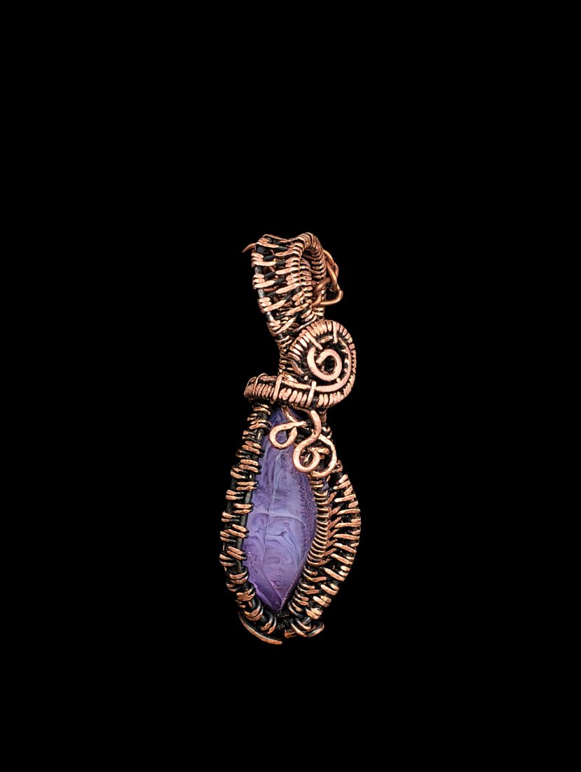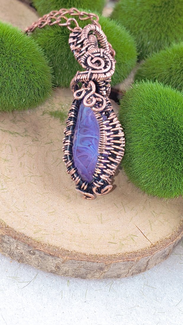 Miedziany wisiorek oksydowany wykonany techniką ground wire wrapping z autorskim kamieniem z żywicy epoksydowej.
