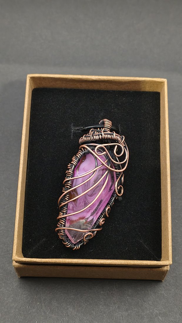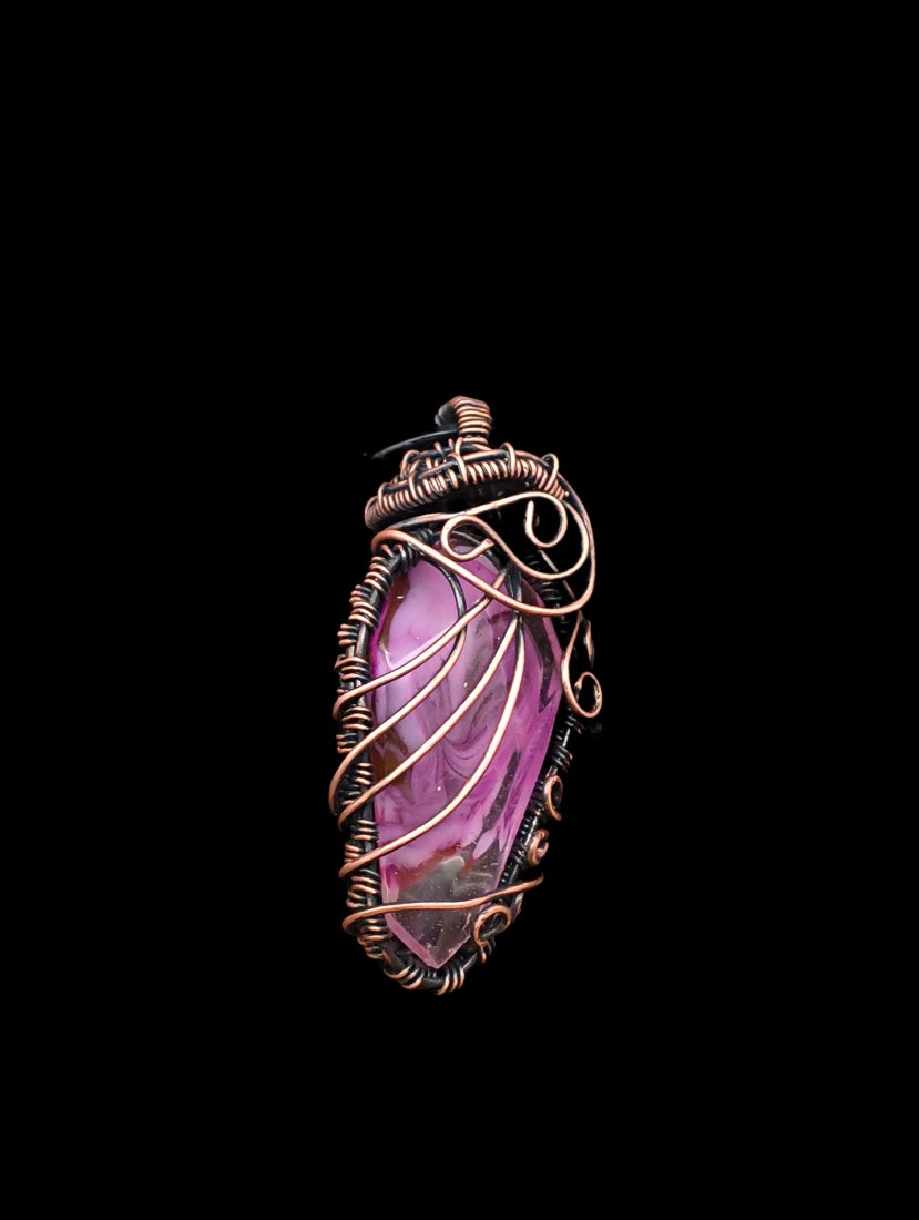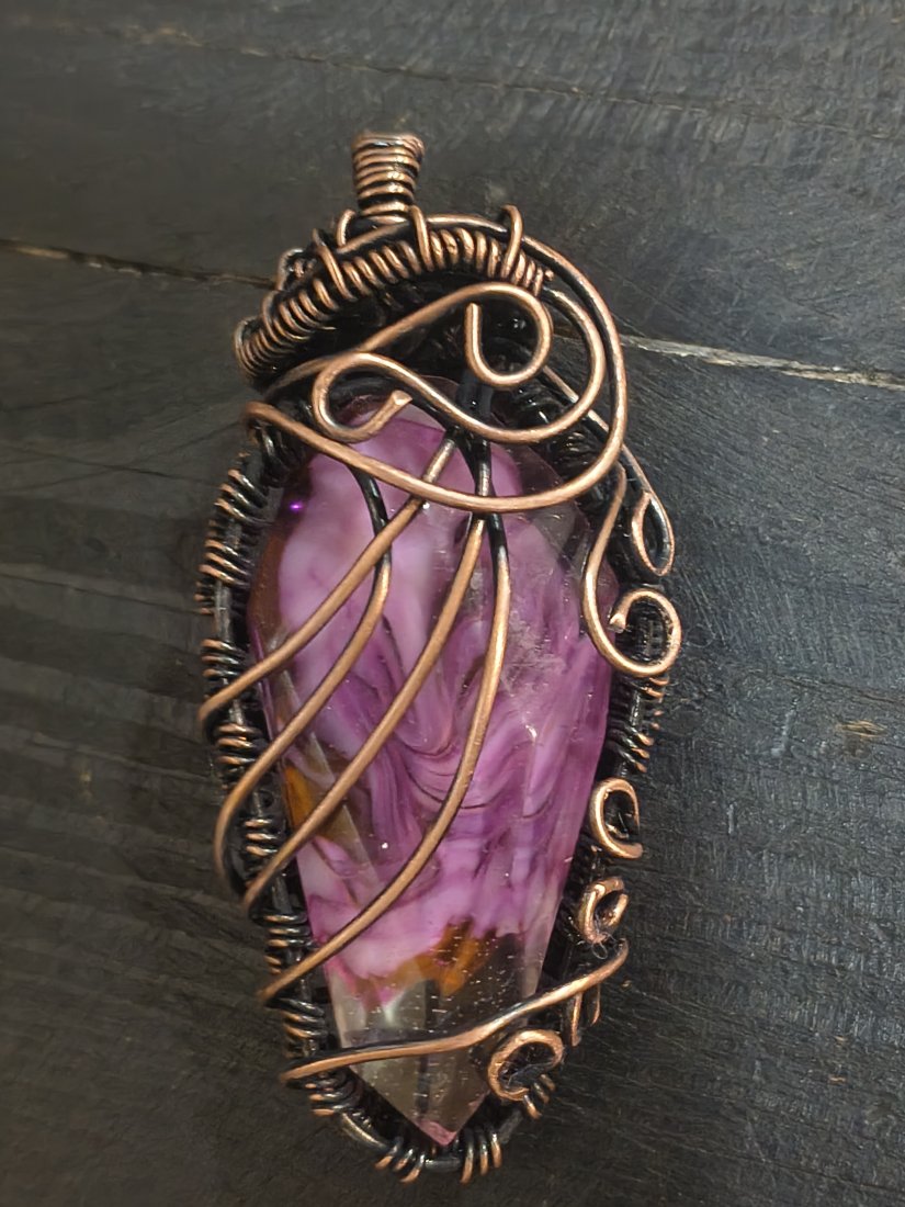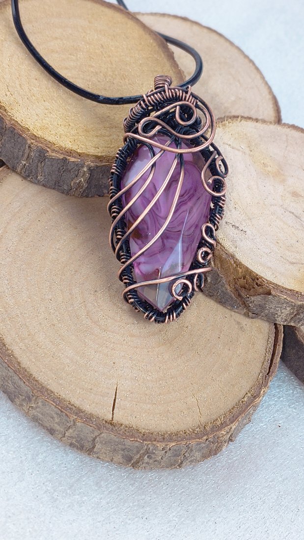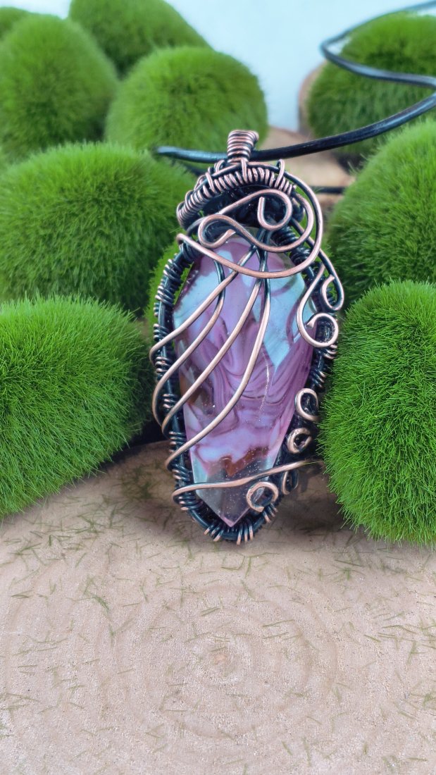 Miedziany wisiorek oksydowany wykonany techniką Wire Wrapping z autorskim kamieniem z żywicy epoksydowej