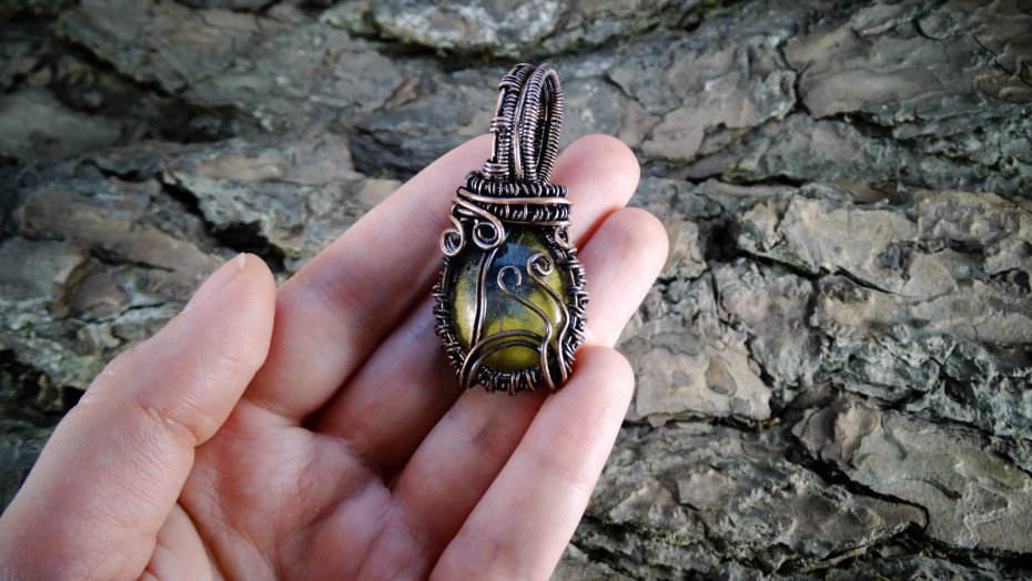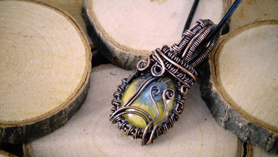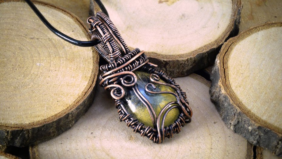 Miedziany wisiorek oksydowany wykonany techniką Wire Wrapping z autorskim kamieniem z żywicy zabezpieczony lakierem akrylowym.