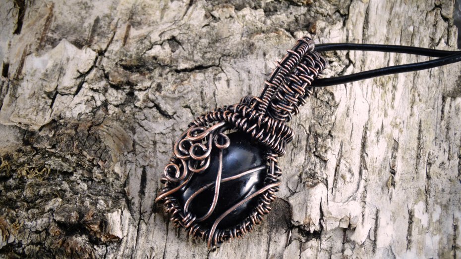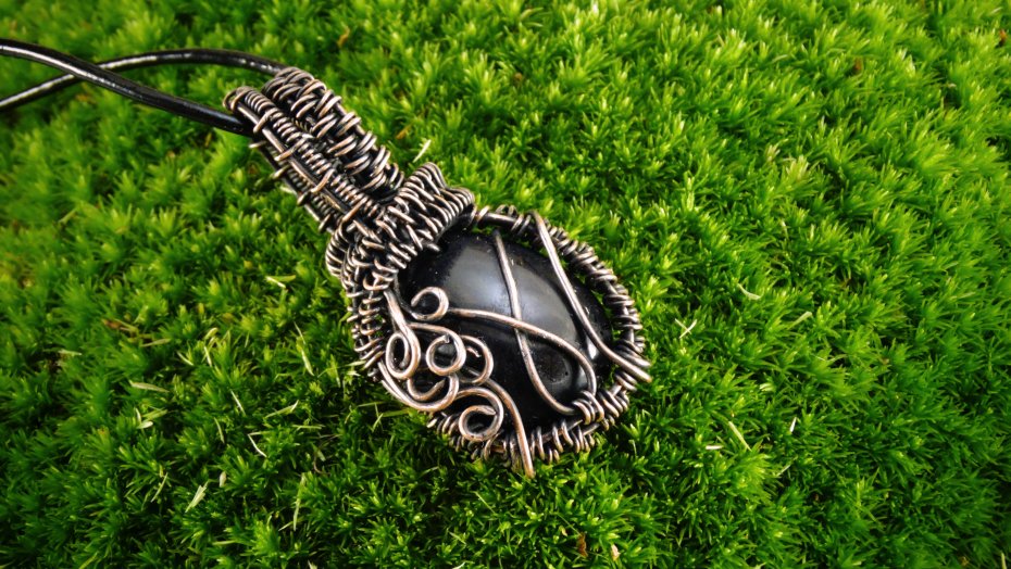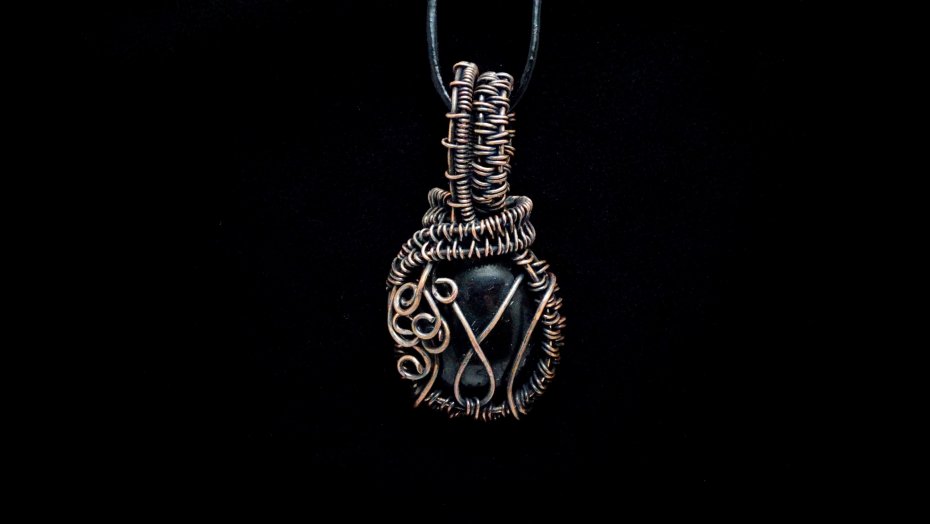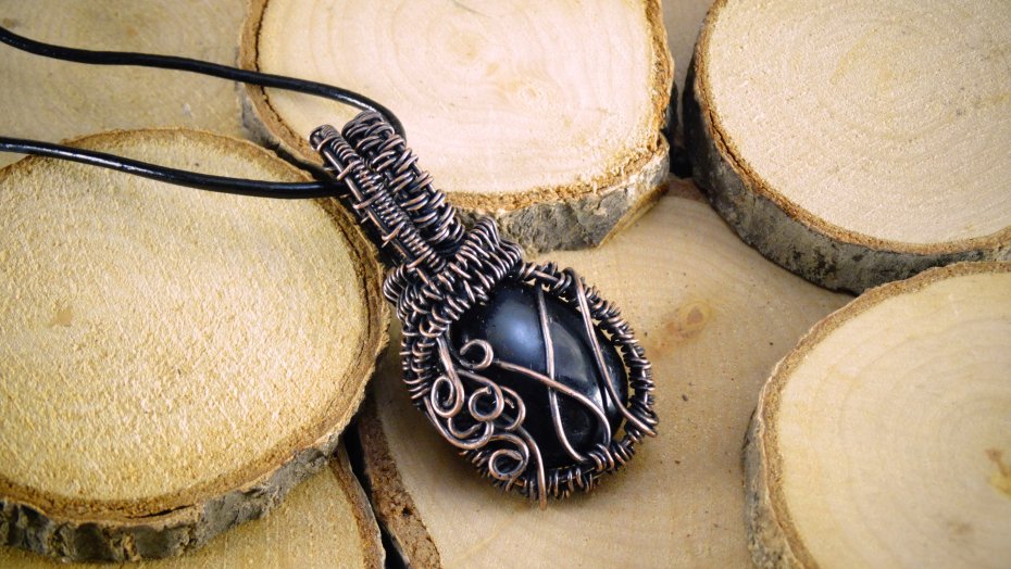 Miedziany wisiorek oksydowany wykonany techniką Wire Wrapping z autorskim kamieniem z żywicy zabezpieczony lakierem akrylowym.