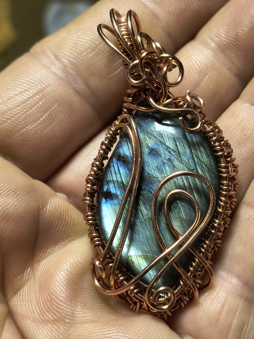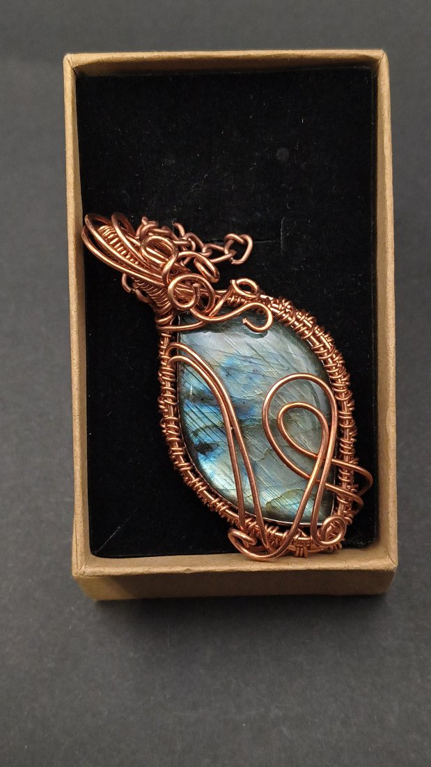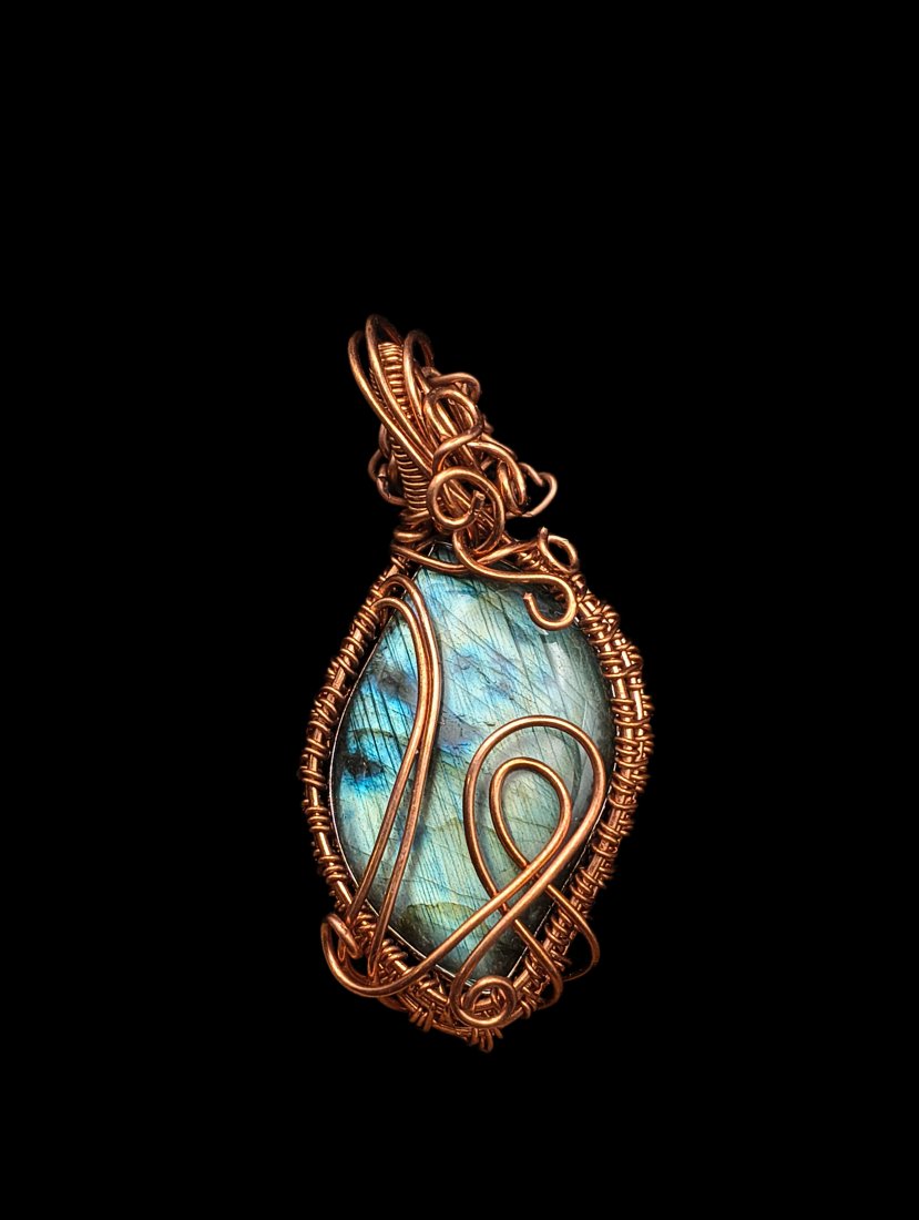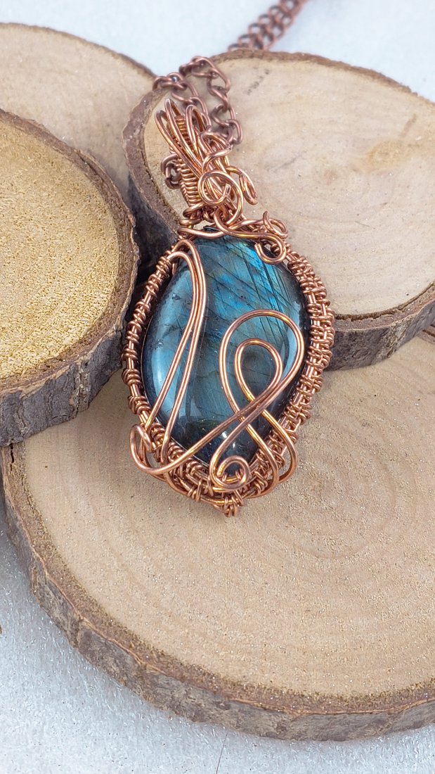 Miedziany wisior z labradorytem wykonany techniką wire wrapping, nie oksydowany, naturalna miedź. Przepięknie mieniący się kamień w misternie wykonanym oplocie.